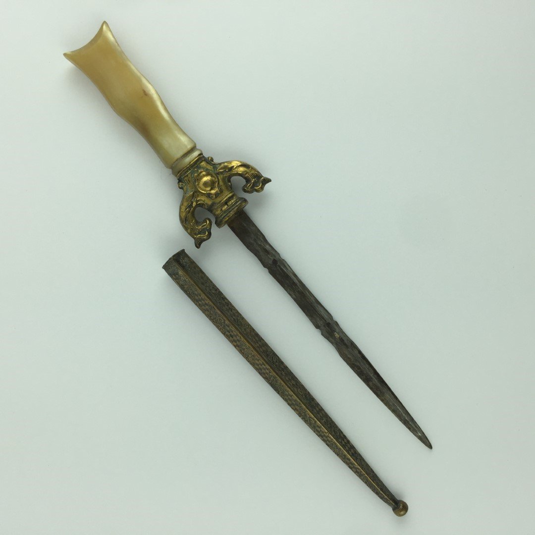 Daga de la misericordia, europea. Hoja de tres caras en hierro forjado, con desangrador. Empuñadura en madreperla. Gavilán en bronce estampado, dorado y esculturado «cabezas de aves». Vaina en bronce cincelado. Largo total 24 cm.
