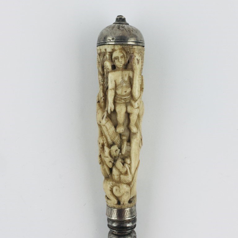 Daga mediterránea, siglo XVIII. Cabo en hueso tallado «Sacrifico de Isaac», con virola y pasador en plata cincelada. Sin vaina. Largo total 36 cm.
