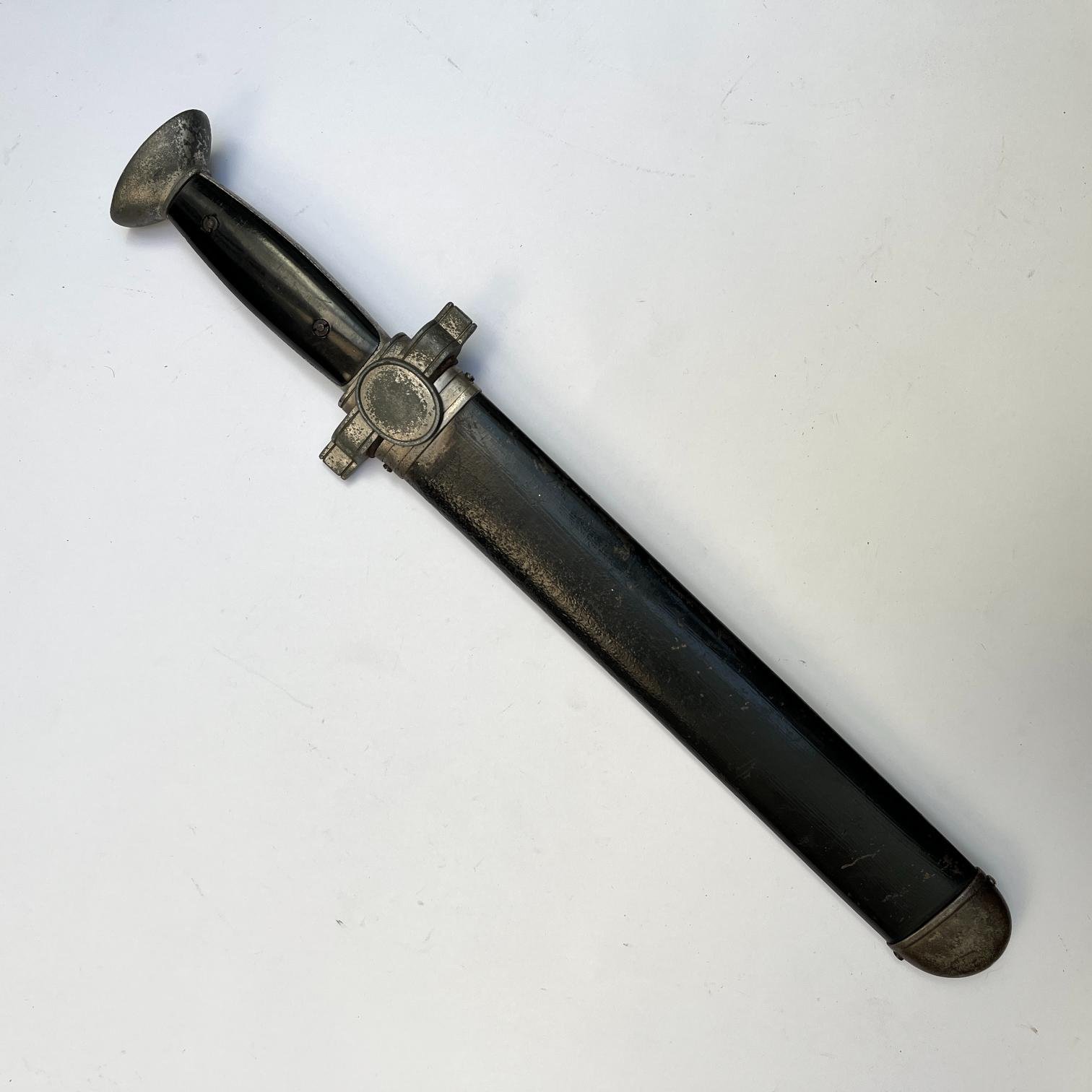 Daga alemana época nacionalsocialista, perteneciente al servicio médico del ejército. Hoja con lomo aserrado. Cachas en baquelita negra. Largo 41,5 cm.