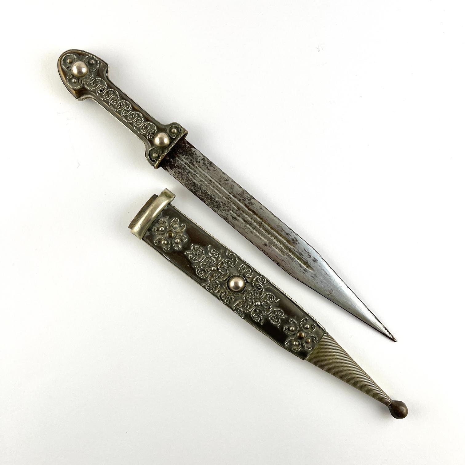 Daga caucásica tipo kindjal. Empuñadura en metal con filigrana de plata. Hoja doble filo con desangradores. Vaina en metal con filigrana y alambre de plata. Largo total 35 cm.