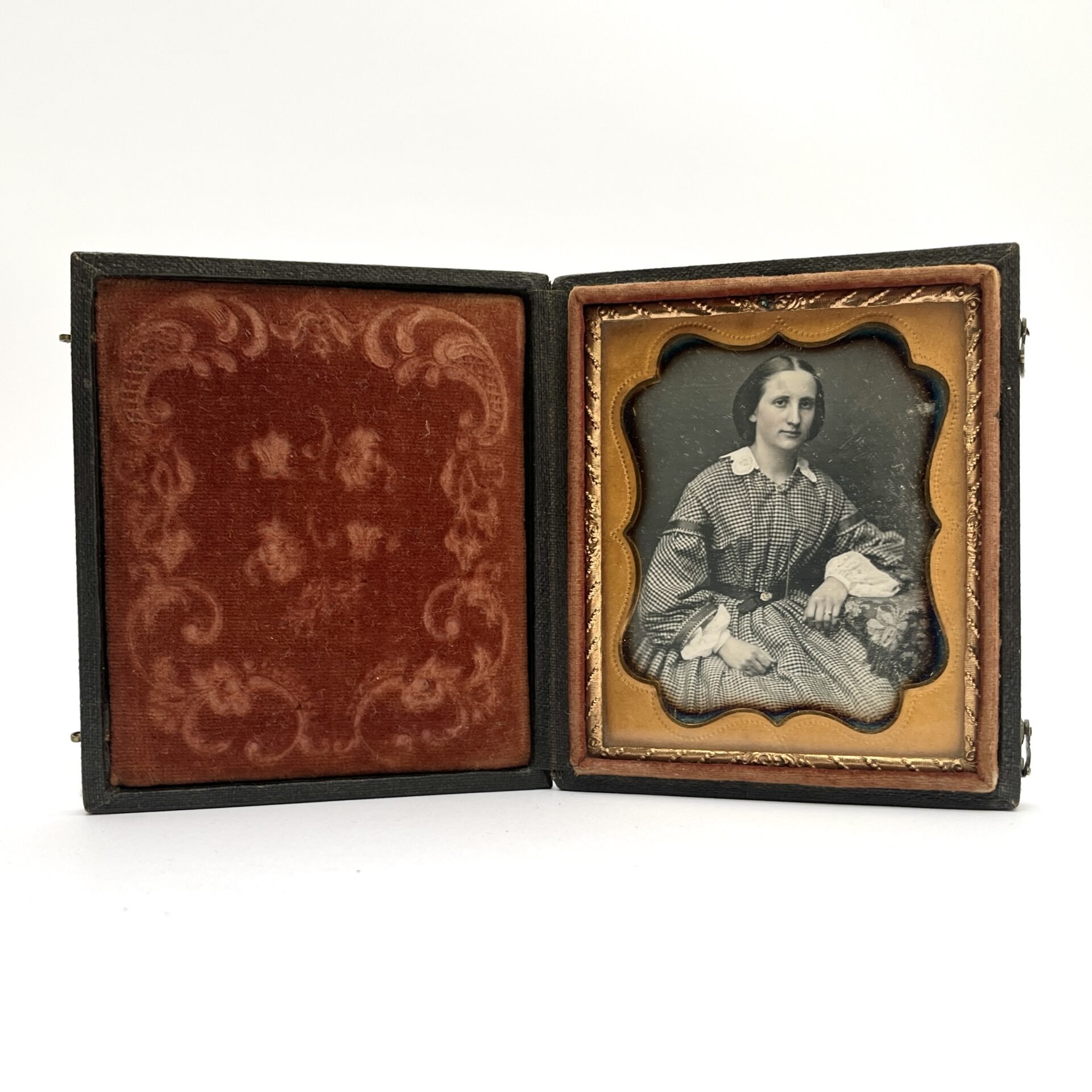 Daguerrotipo de un cuarto (1/4) de placa -8 x 6,7 cm- en su estuche de época. Se observa la típica oxidación periférica – que no afecta la imagen – de sulfuro de plata.