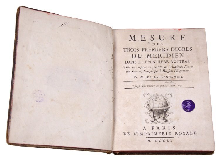 DE LA CONDAMINE, CHARLES MARIE. “Journal du Voyage fait par ordre du Roi, à L’Équateur, servant d’introduction historique a la mesure des trois premiers degrés du Méridien”. París, 1751.