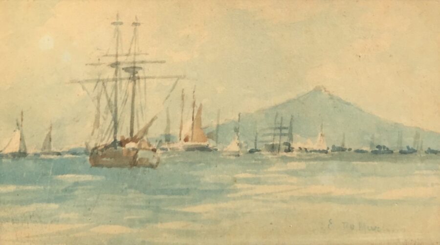 DE MARTINO, Eduardo (Italia, 1838-1912). Acuarela sobre papel. «Bahía y Cerro de Montevideo.» Firmado abajo a la derecha. 9 x 15 cm.