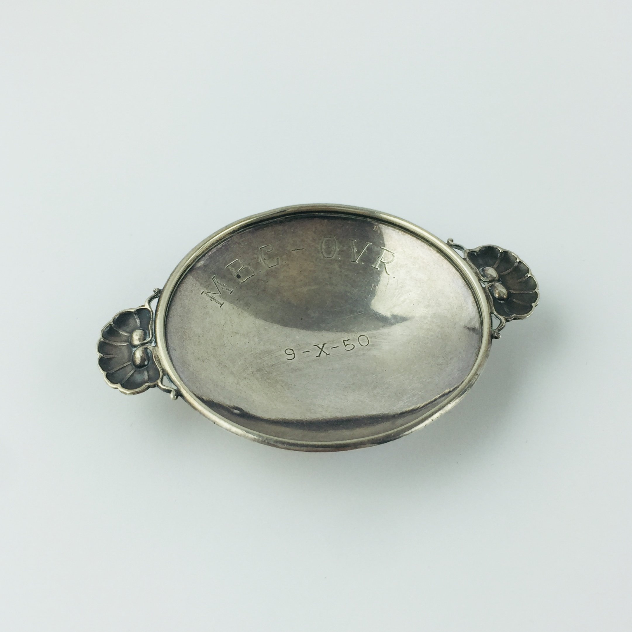Pequeño despojador art decó dinamarqués en plata, diseñado por Georg Jensen, con dos asas esculturadas «valvas» y dedicatoria grabada. Diámetro 57 mm. Peso 24 gr.