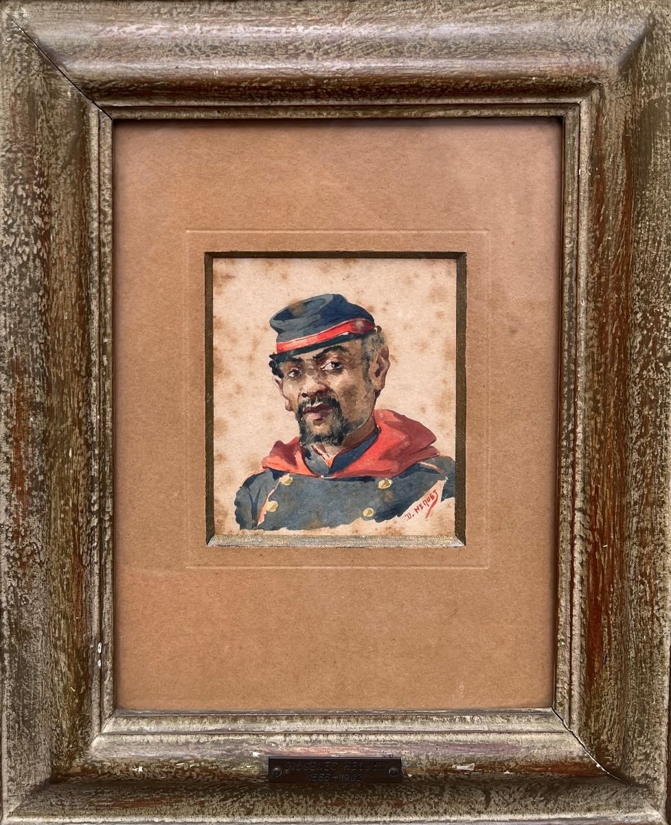 DIÓGENES HEQUET (1866-1902). Acuarela sobre papel. «Soldado oriental.» Firmado abajo a la derecha. 11 x 10 cm. Presenta manchas de humedad.