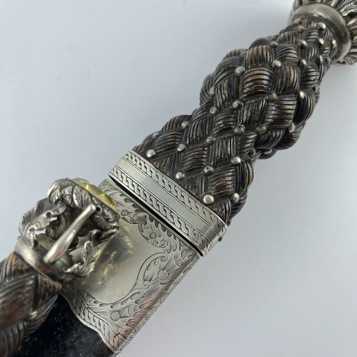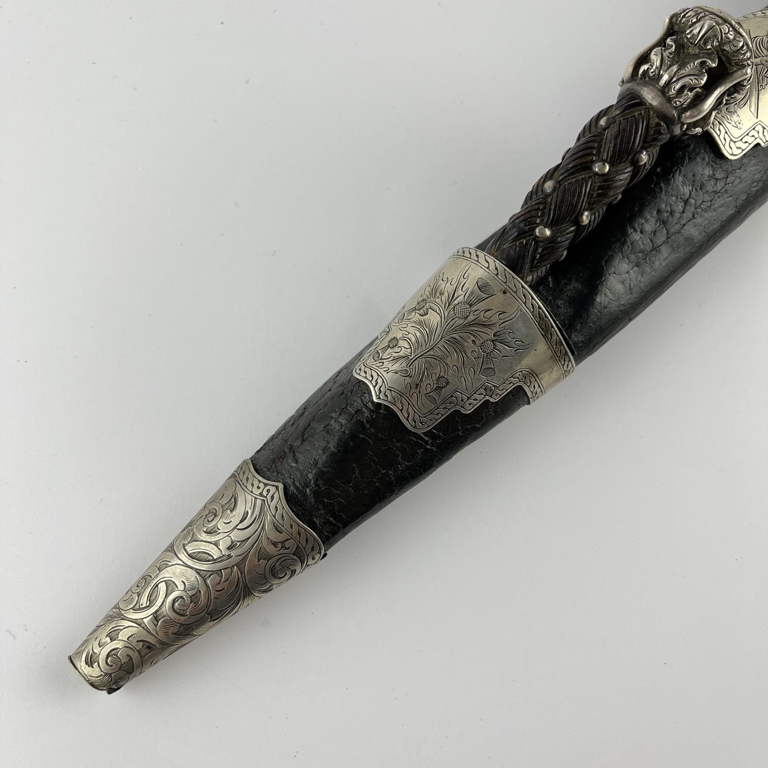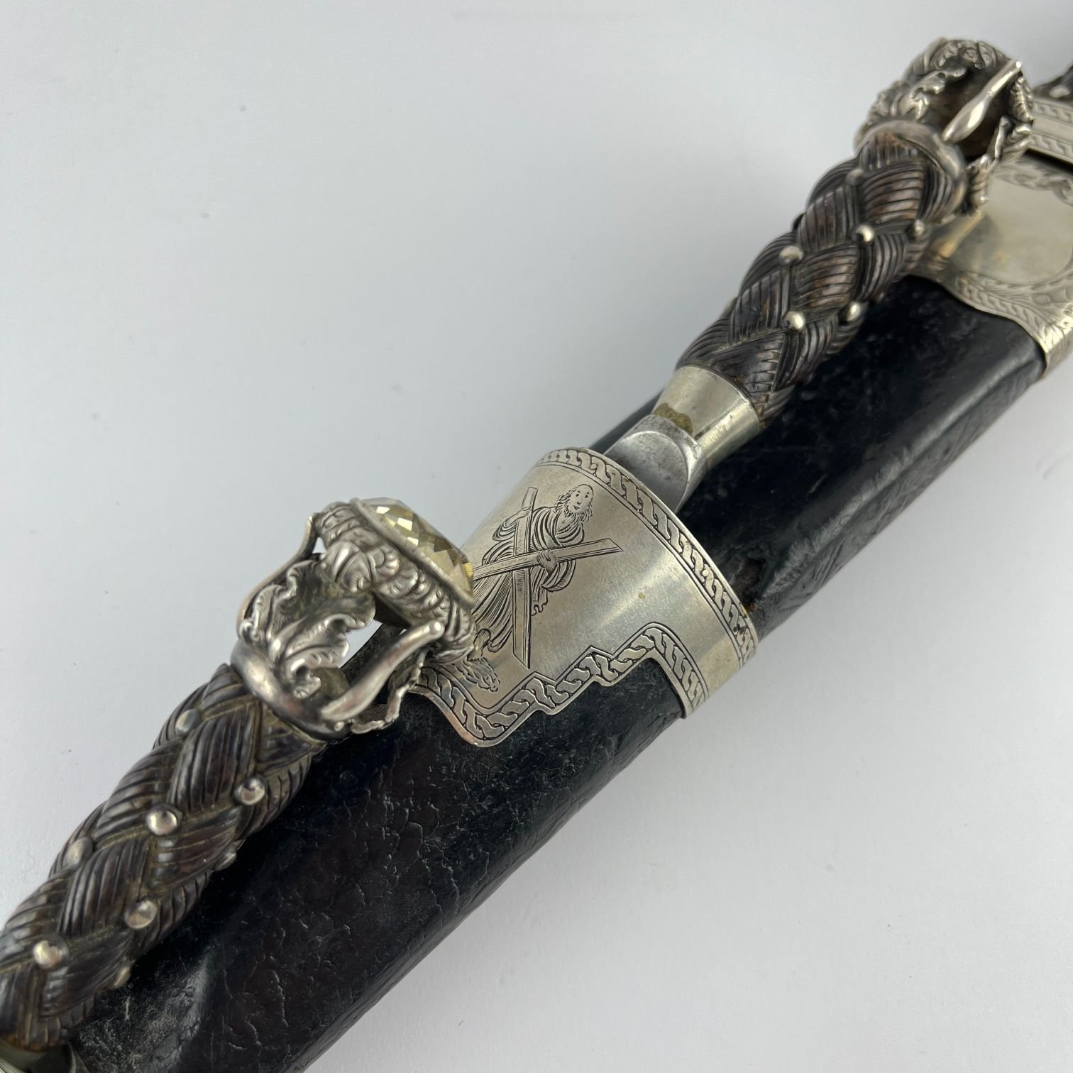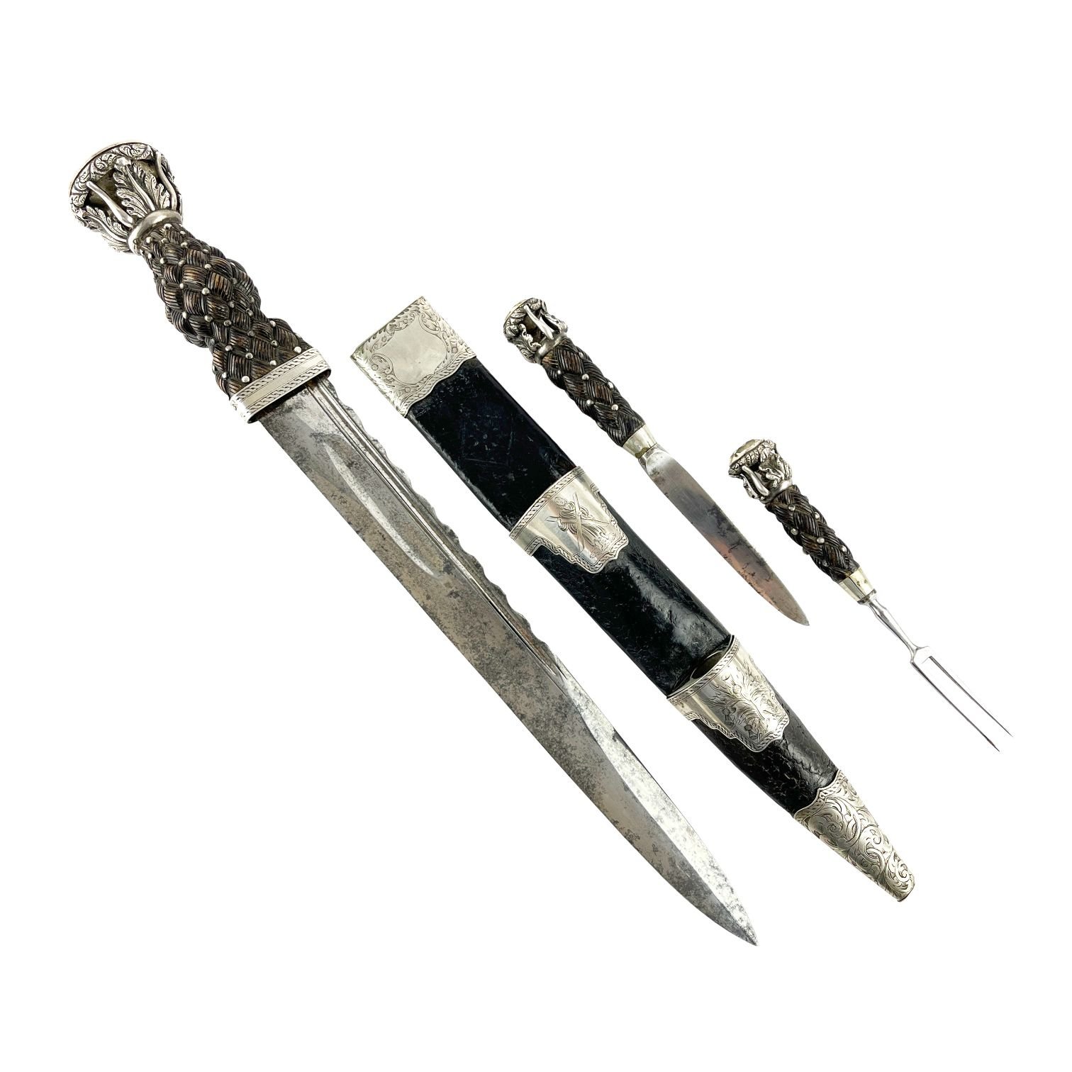 Dirk escocés s. XIX fabricado por Joseph Rodgers & Sons. Hoja con lomo amuescado. Cabo en madera tallada «nudos», con aplicaciones y pomo rematado en plata y topacio. Vaina picasa forrada en cuero con bocavaina, puntera y portacubiertos en plata cincelada «San Andrés». Acompañado de cuchillo y tendedor con cabos en madera tallada rematados en plata y topacio.