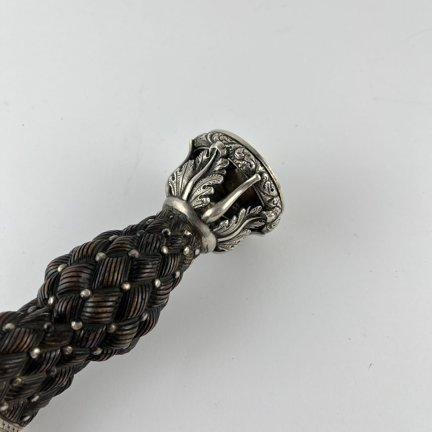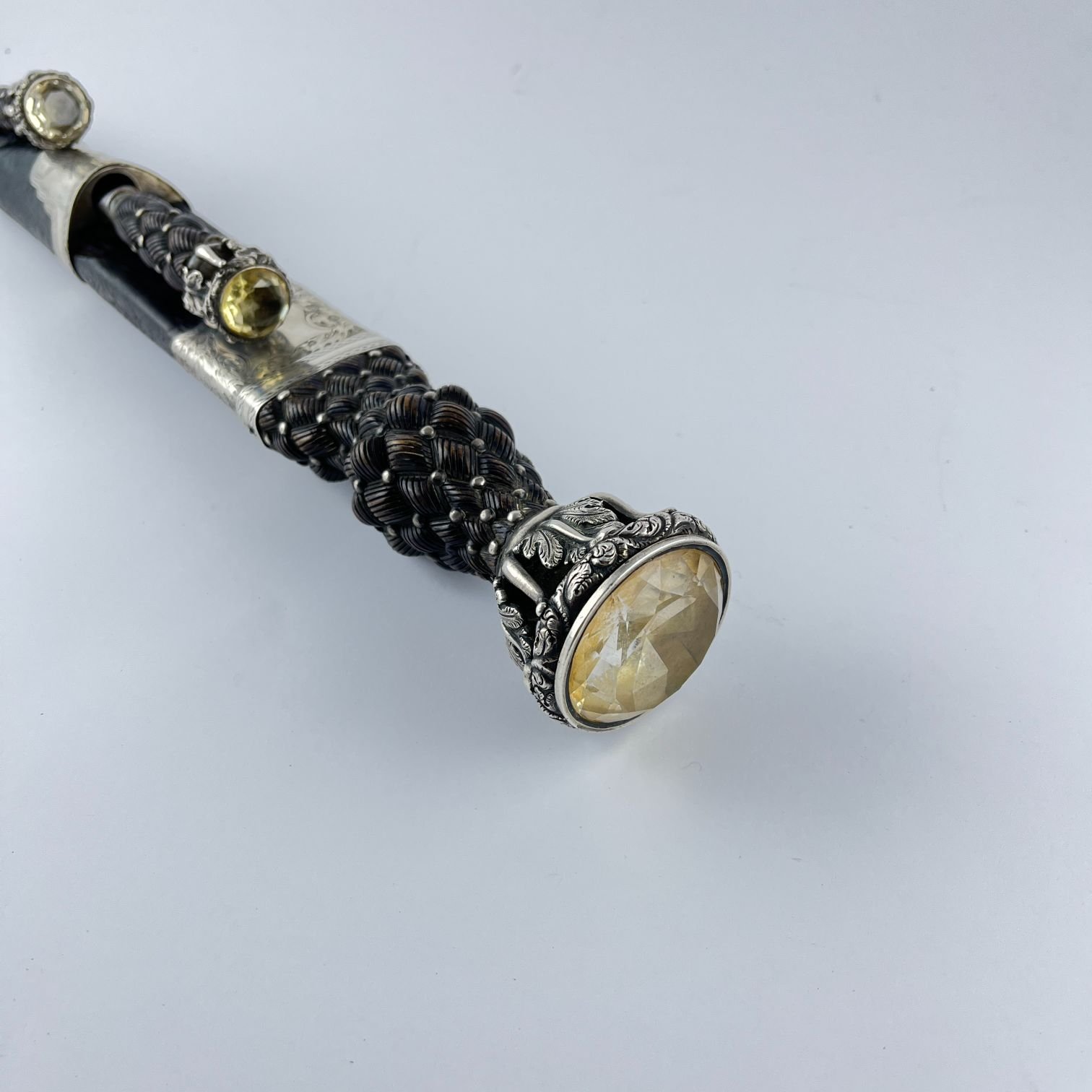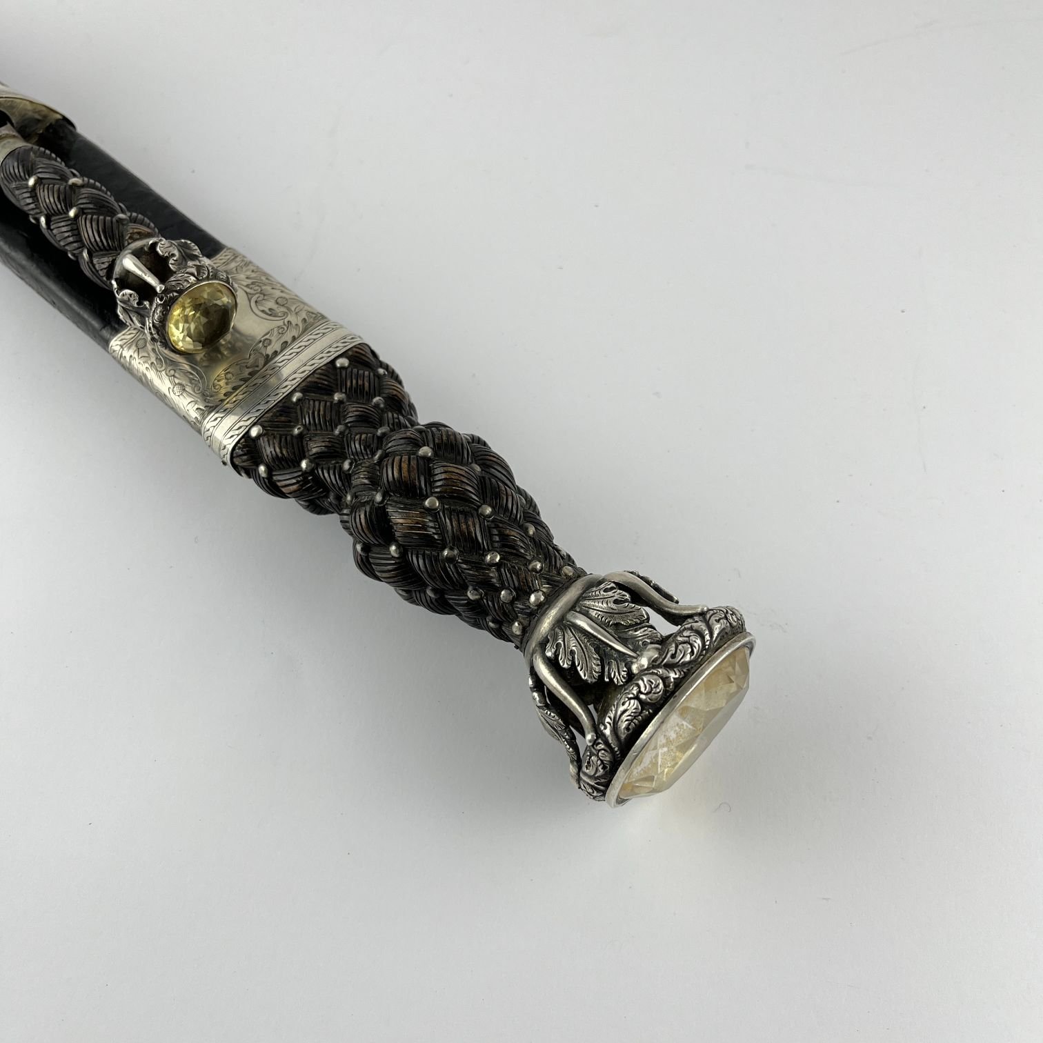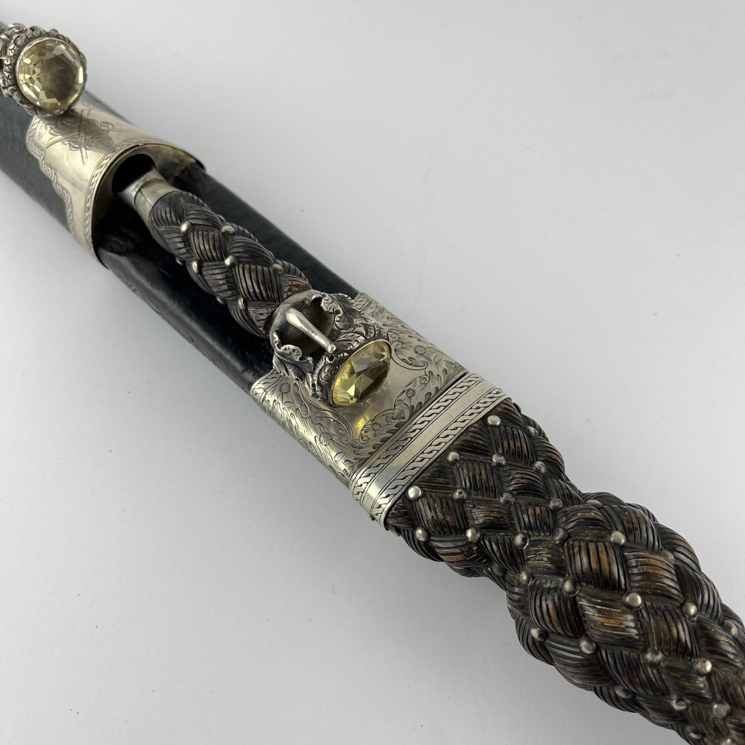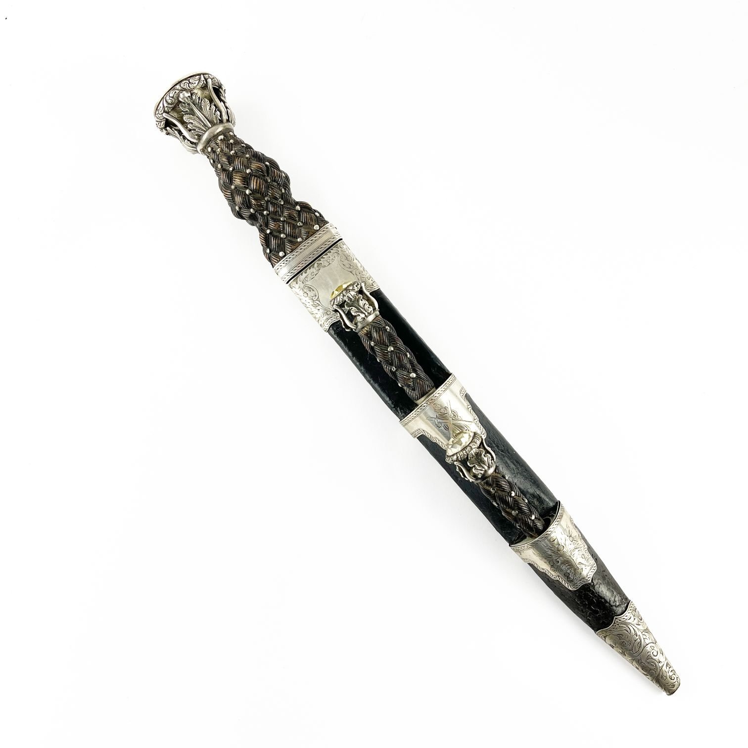 Dirk escocés s. XIX fabricado por Joseph Rodgers & Sons. Hoja con lomo amuescado. Cabo en madera tallada «nudos», con aplicaciones y pomo rematado en plata y topacio. Vaina picasa forrada en cuero con bocavaina, puntera y portacubiertos en plata cincelada «San Andrés». Acompañado de cuchillo y tendedor con cabos en madera tallada rematados en plata y topacio.