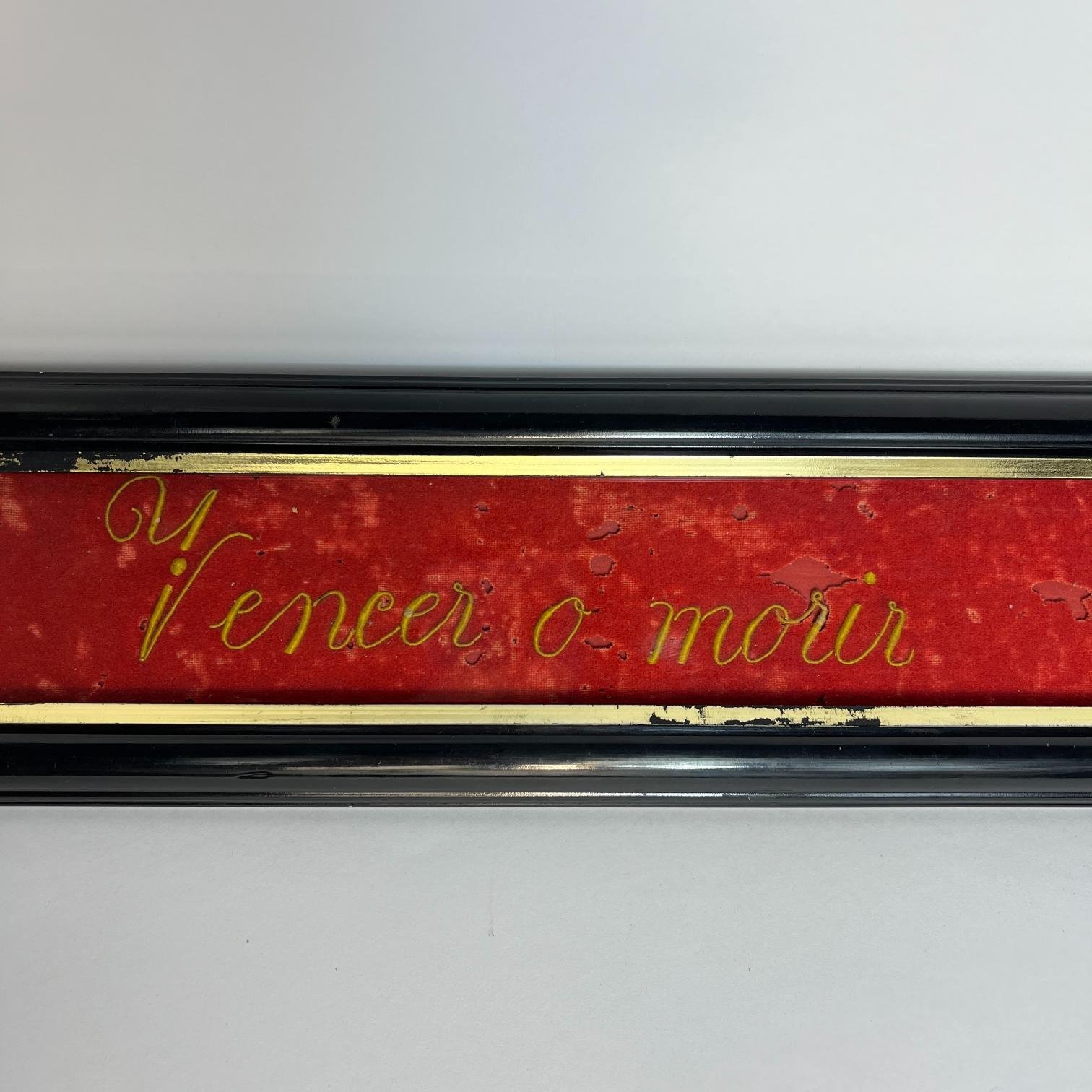Divisa del Partido Colorado en terciopelo con leyenda «Vencer o morir» bordada en hilo amarillo, s. XIX. Medidas 52 x 5 cm. Enmarcada.