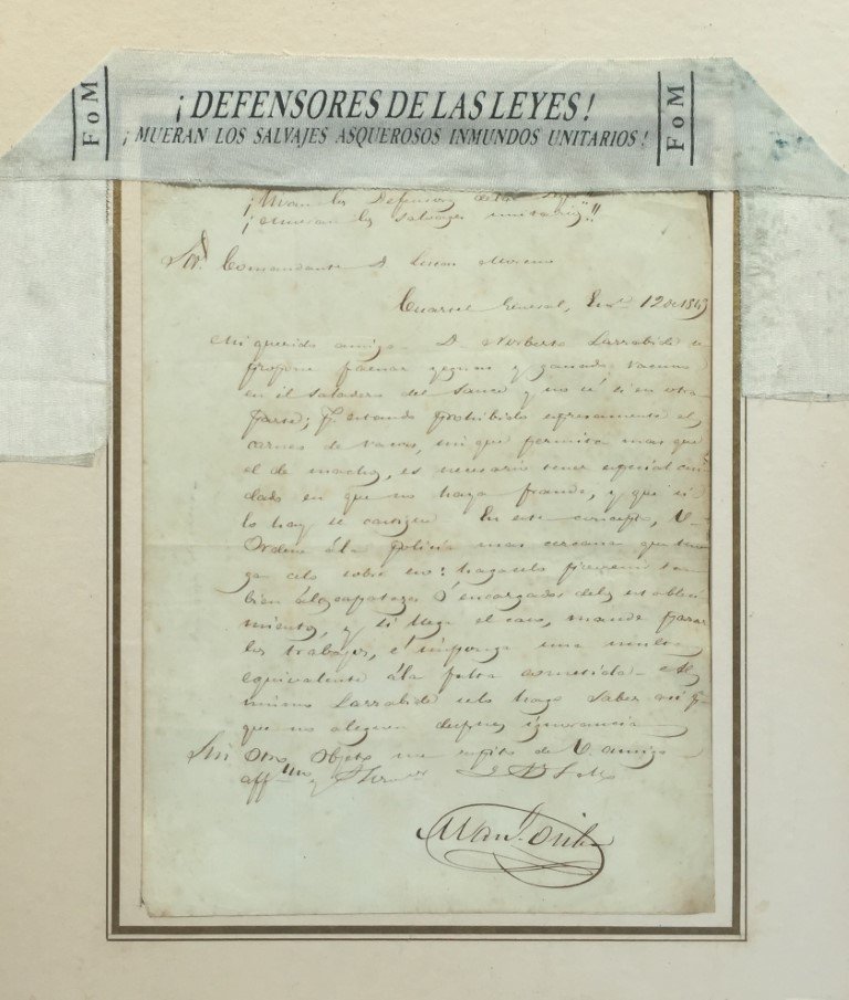 Divisa en seda blanca estampada con inscripción «¡Defensores de las Leyes! Mueran los salvajes asquerosos inmundos unitarios”, acompañada de documento manuscrito fechado en enero de 1849 y firmado por Manuel Oribe, situado «cuartel general», en el cual se advierte al comandante Lucas Moreno que «Norberto Larrabide se propone faenar en el saladero del Sauce», y que «estando expresamente prohibido el carneo de vacas es necesario tener especial cuidado en que no haya fraude, y que si lo hay se castigue». 1 folio. Enmarcados.