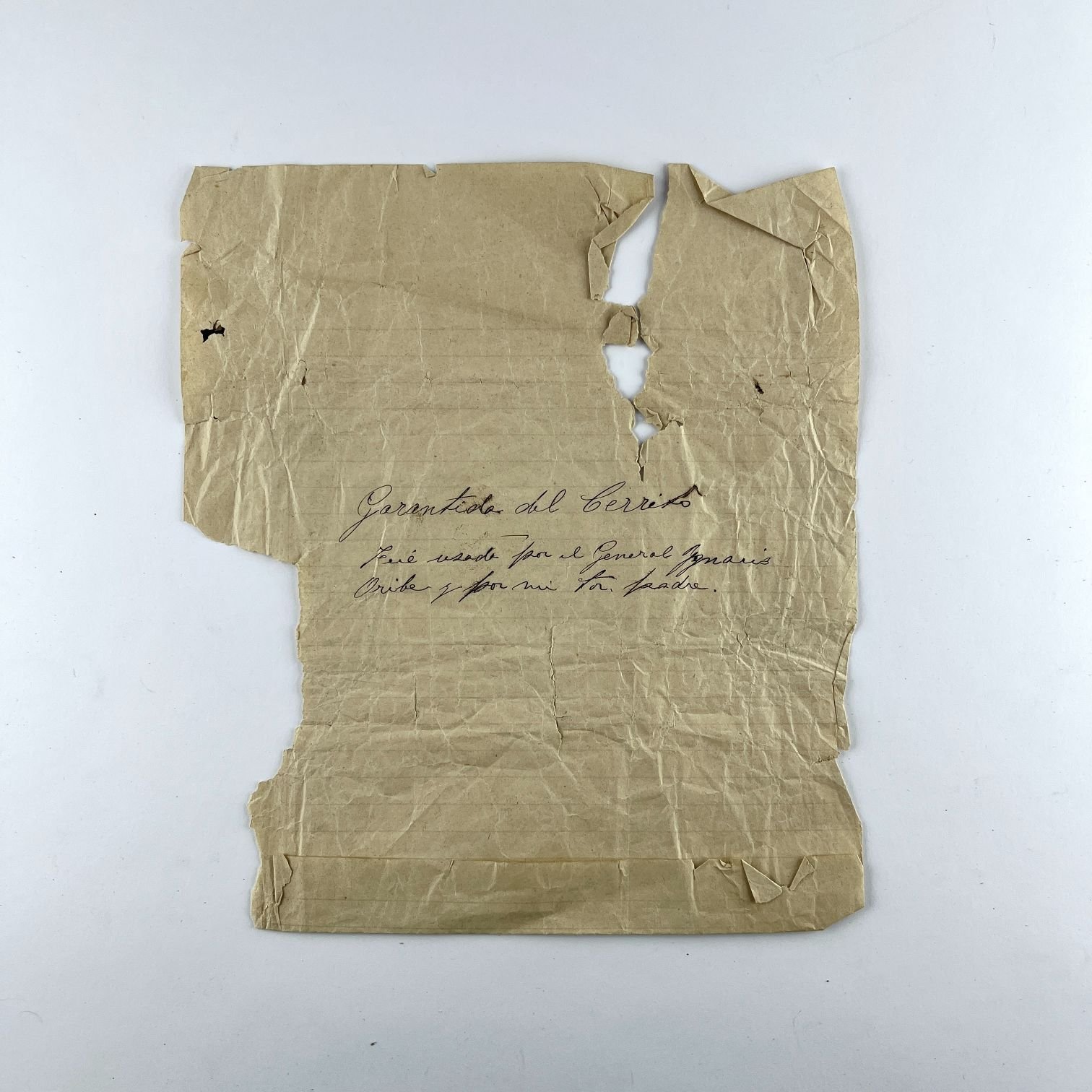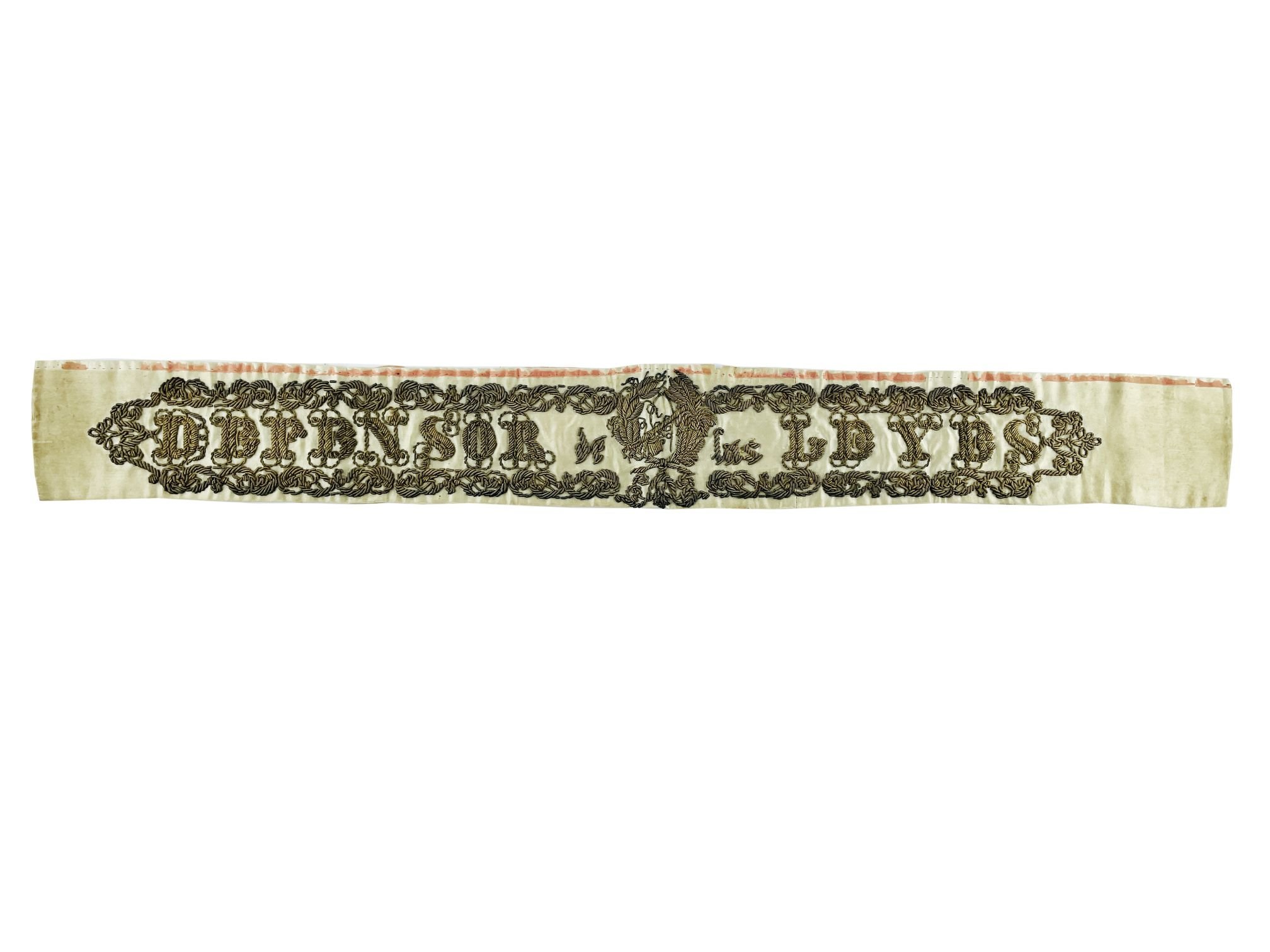 Divisa uruguaya en seda blanca, perteneciente al Partido Blanco, s. XIX, con leyenda bordada en filigrana de plata dorada: «Defensor de las Leyes». 7 x 60 cm. Acompañada por antigua nota manuscrita con inscripción “Garantida del Cerrito. Fue usada por el General Ignacio Oribe y por mi Sr. Padre”.