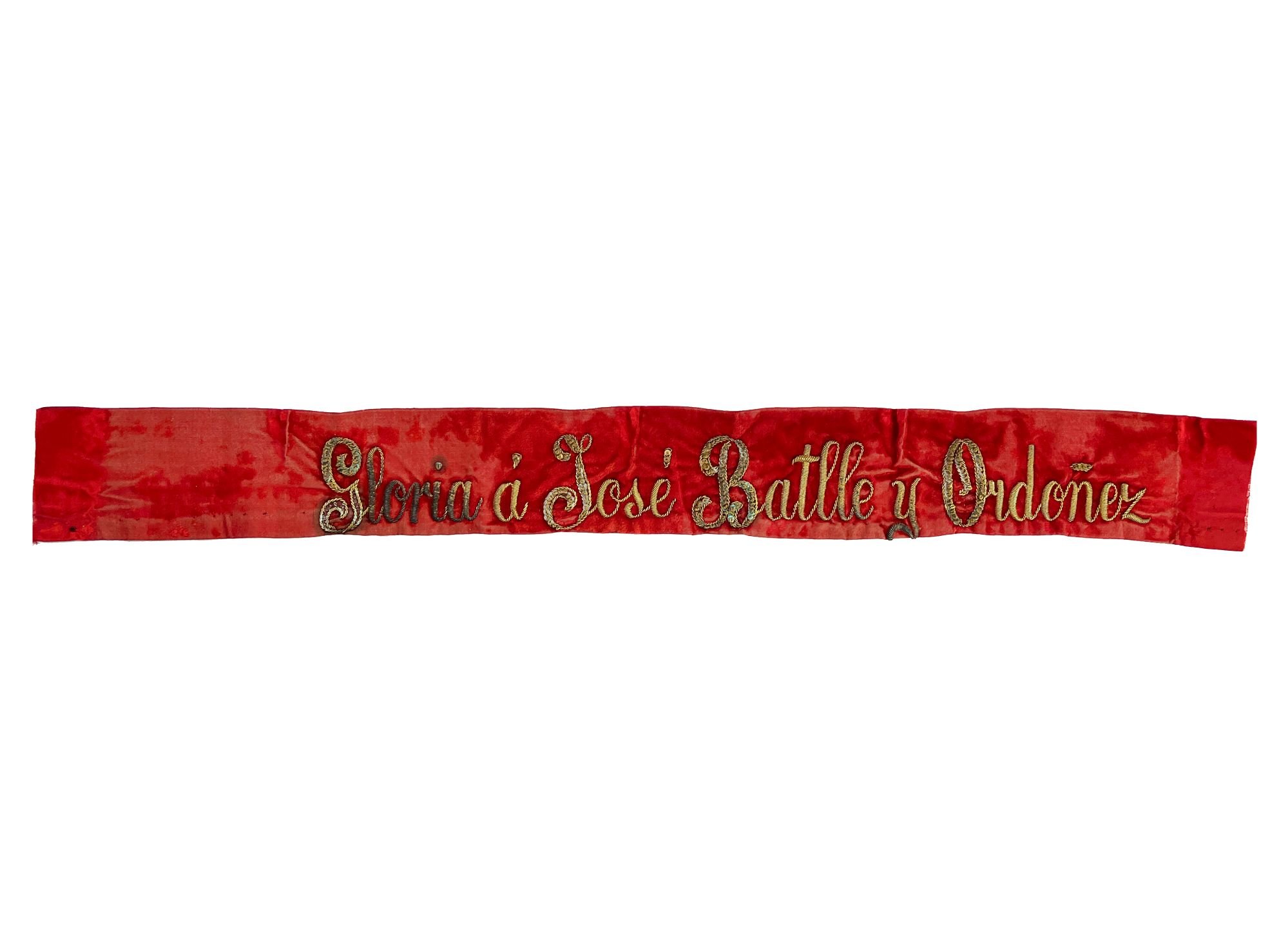 Divisa uruguaya en seda roja, perteneciente al Partido Colorado, con leyenda bordada en filigrana dorada: «Gloria a José Batlle y Ordóñez». 7 x 62 cm.