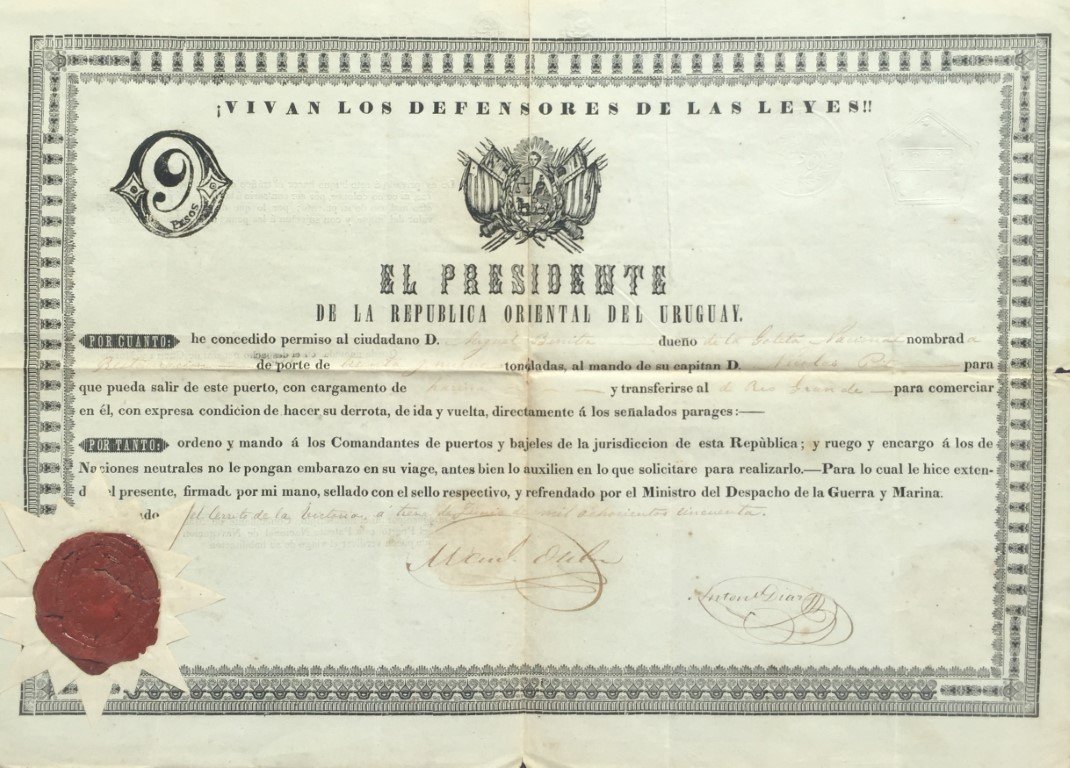 Documento impreso y manuscrito, con sello de lacre, firmado por Manuel Oribe, situado en el Cerrito de la Victoria y fechado en junio de 1850, por el cual «el Presidente de la República Oriental del Uruguay» otorga permiso a «la goleta nacional Restauración para que pueda salir de este puerto». 1 folio. 32 x 43 cm. Enmarcado.