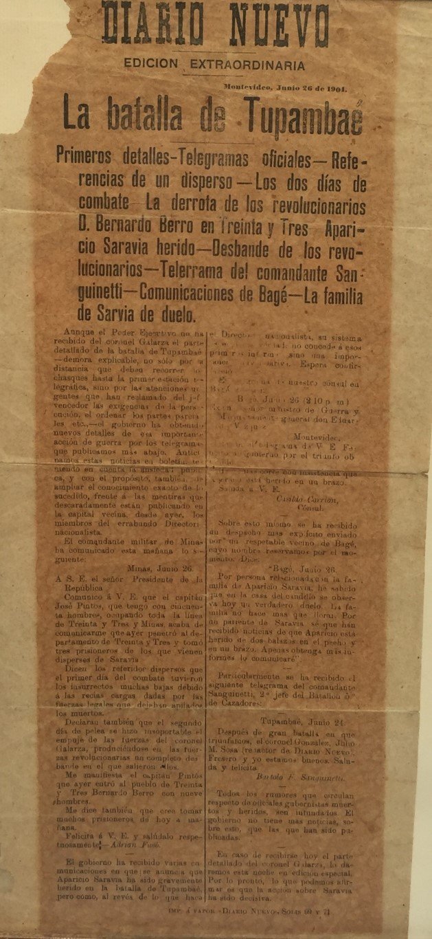 Documento impreso. «Diario Nuevo. Edición extraordinaria. Batalla de Tupambaé (…) Aparicio Saravia Herido. Desbande de los revolucionarios.» Montevideo, 26 de junio de 1904. Imprenta a vapor. Faltante en papel. Enmarcado.