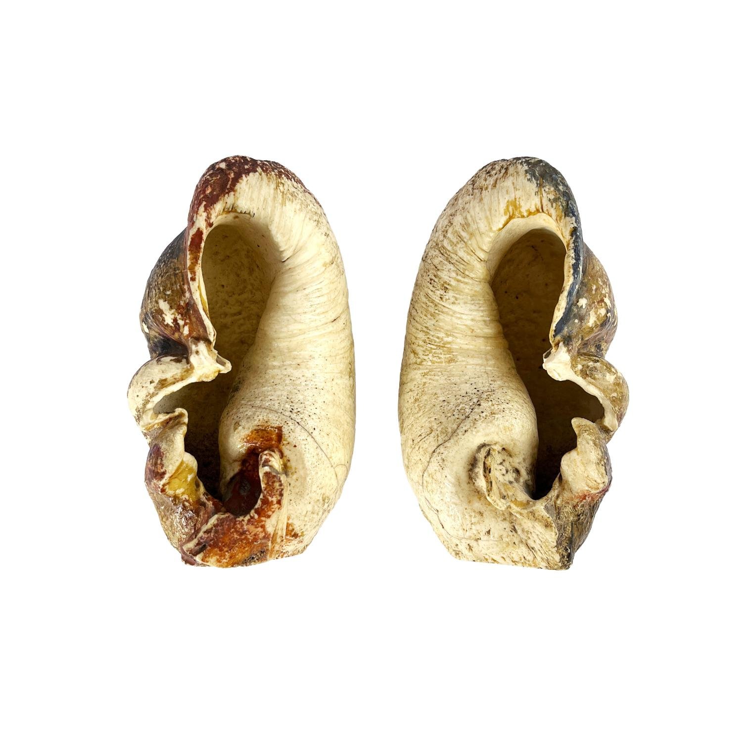 Dos huesos de tímpano de ballena, pintados a mano “rostros”. Se trata de artesanías producidas por tripulantes de buques balleneros hacia finales del siglo XIX y principios del siglo XX.