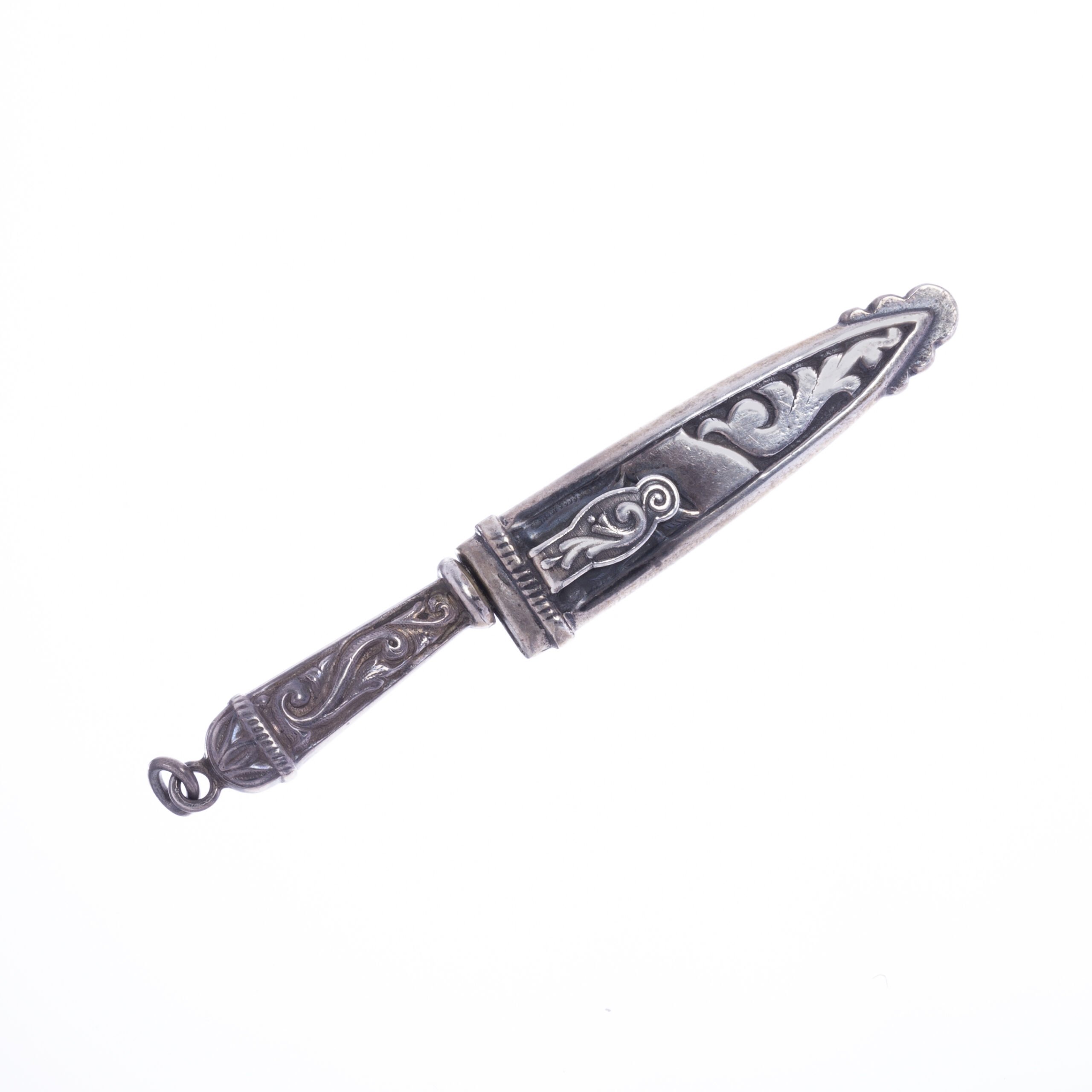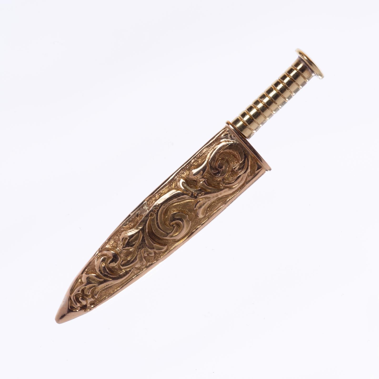 Dos miniaturas de cuchillo criollo con hojas en acero inoxidable. Uno con cabo y vaina en oro amarillo cincelado «flores», de un largo total de 58 mm. Otro con cabo y vaina en plata cincelada «arabescos», de un largo total de 70 mm.