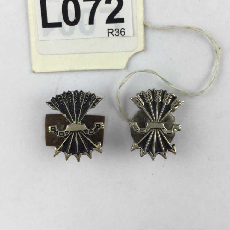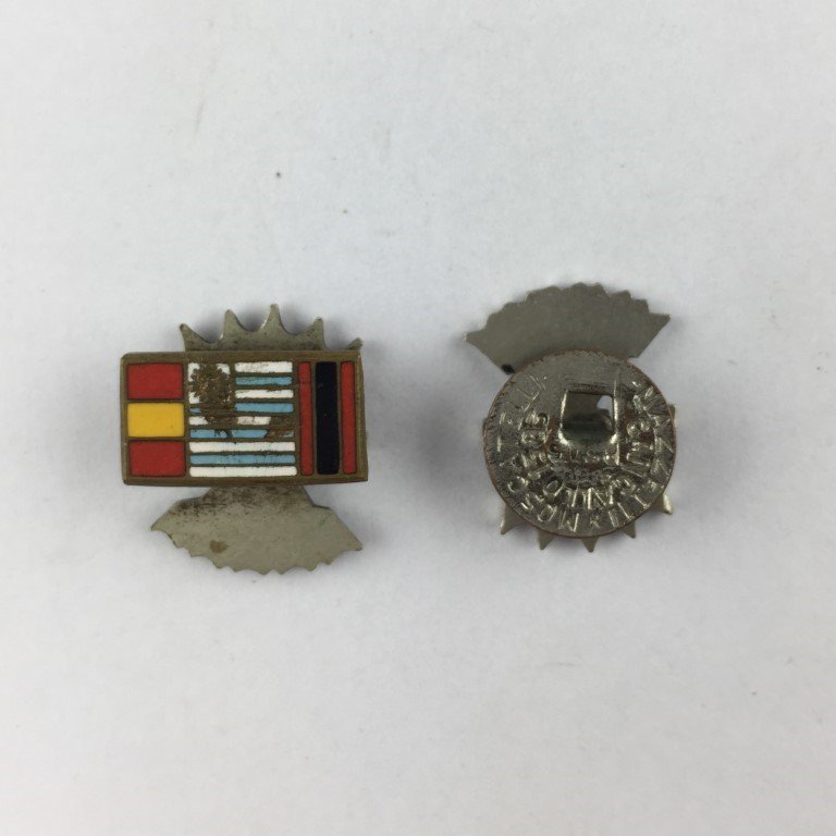 Dos pines solaperos de la Falange Española, en metal, uno de ellos con anverso esmaltado, con banderas uruguaya, española y de la Falange.