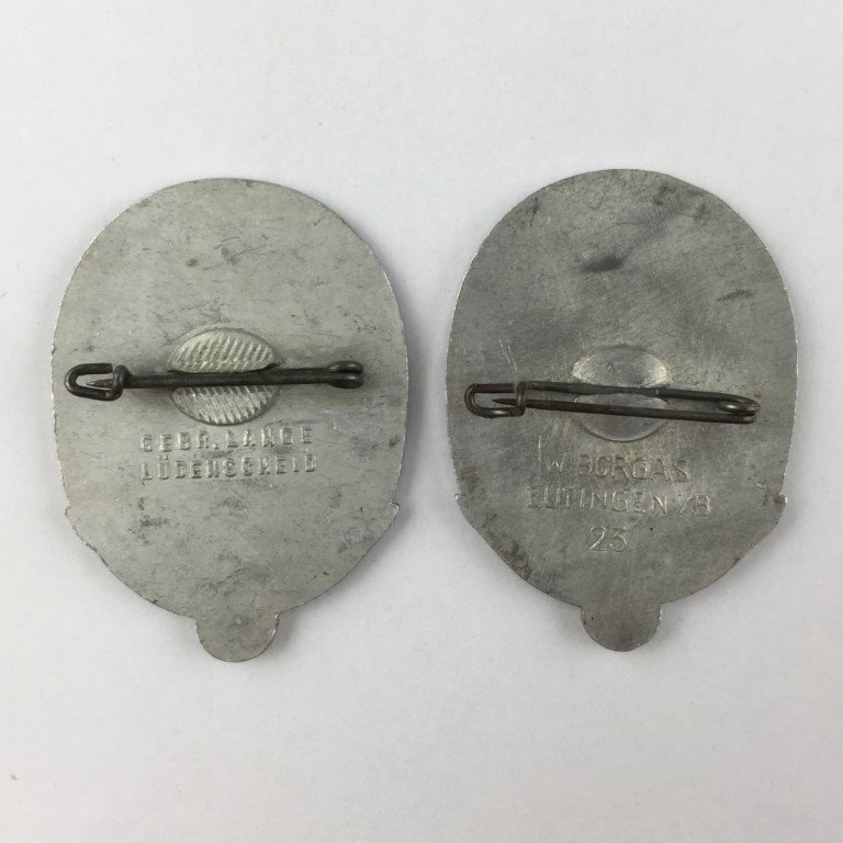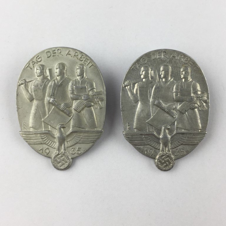 Dos pins alemanes en aluminio conmemorativos del día del trabajador, 1935. Período nacionalsocialista. Diferentes fabricantes.