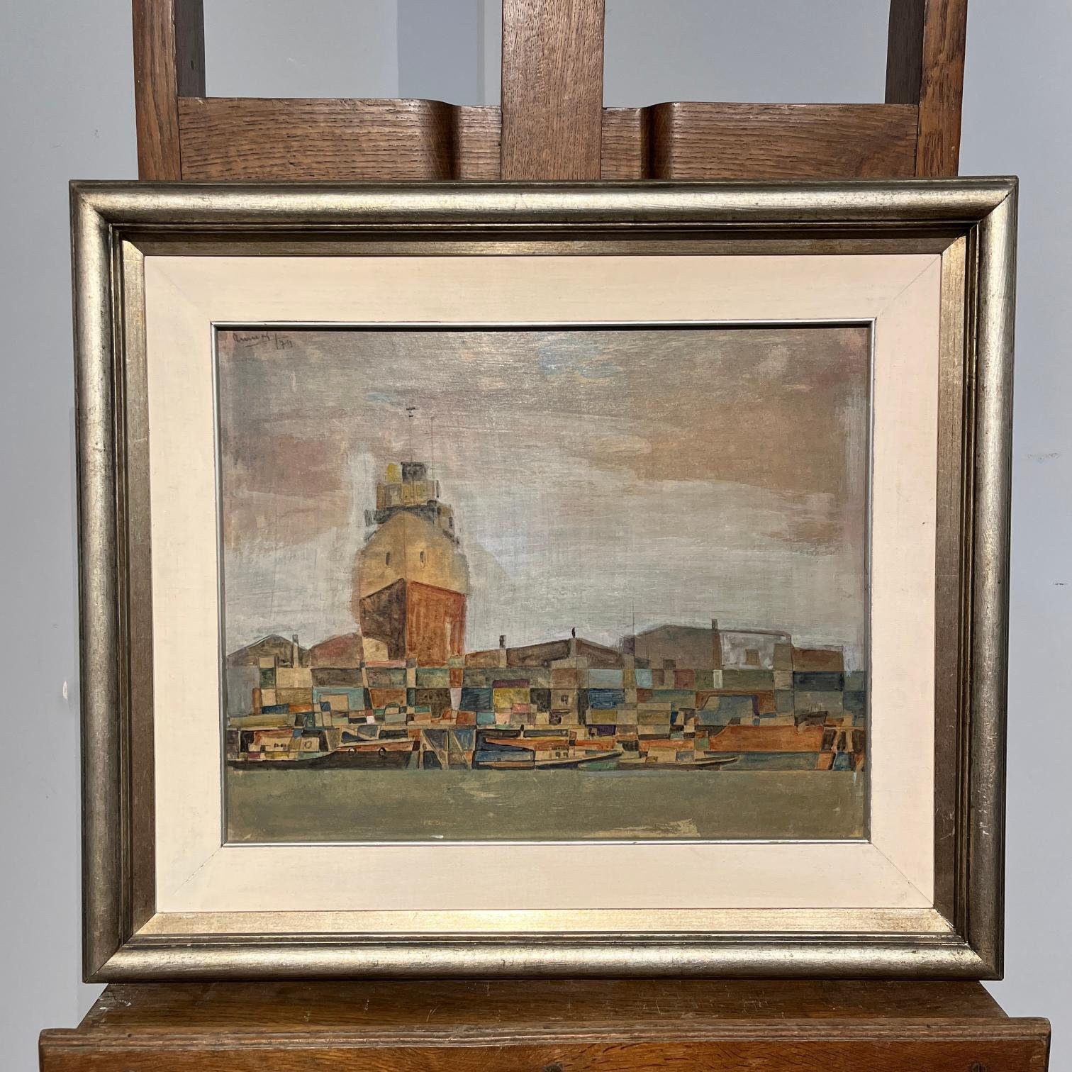 DUMAS OROÑO (Escuela uruguaya, 1921-2005) Técnica mixta sobre cartón «Puerto constructivo» Firmado y fechado «79» arriba a la izquierda 40 x 50 cm