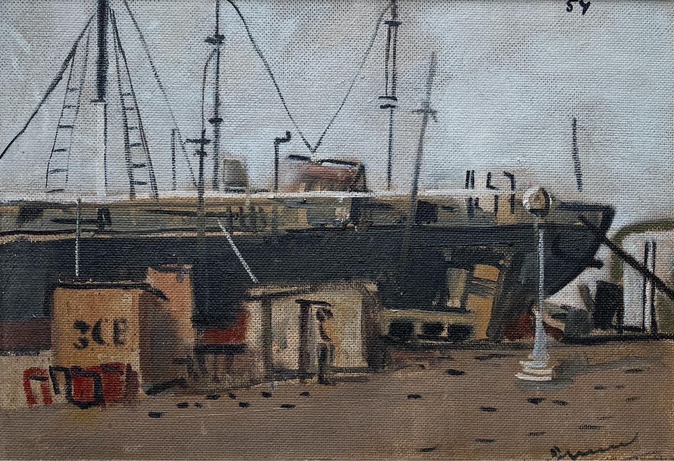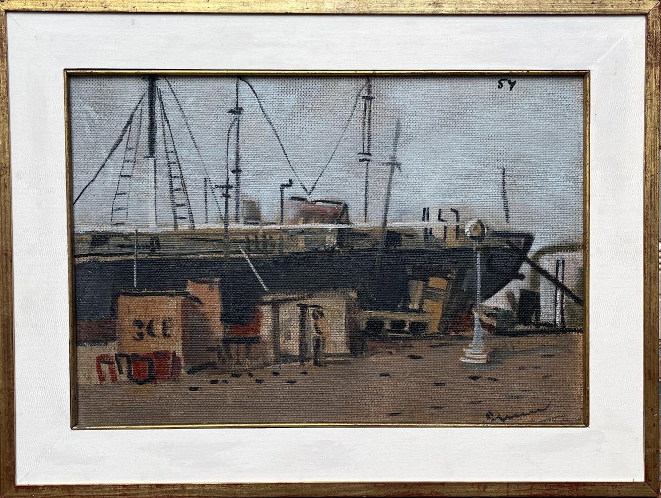 DUMAS OROÑO (Escuela uruguaya, 1921-2005) Óleo sobre fibra «Puerto constructivo» Firmado abajo a la derecha Fechado «54» arriba a la derecha 47,5 x 53 cm