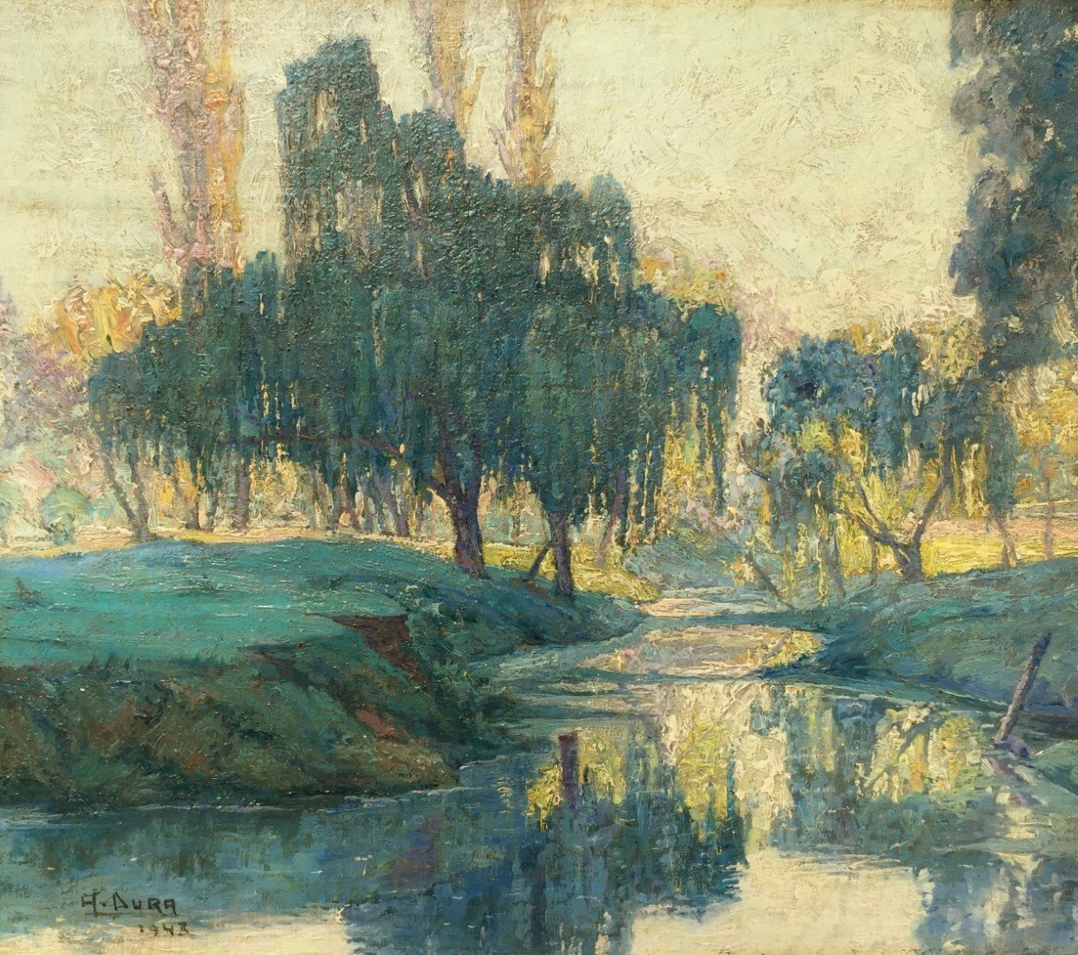 DURA, Alberto (escuela uruguaya, 1888-1971). Óleo sobre tela pegado en cartón. «Arroyo Miguelete.» Firmado y fechado «1943» abajo a la izquierda. 40.5 x 47.5 cm.