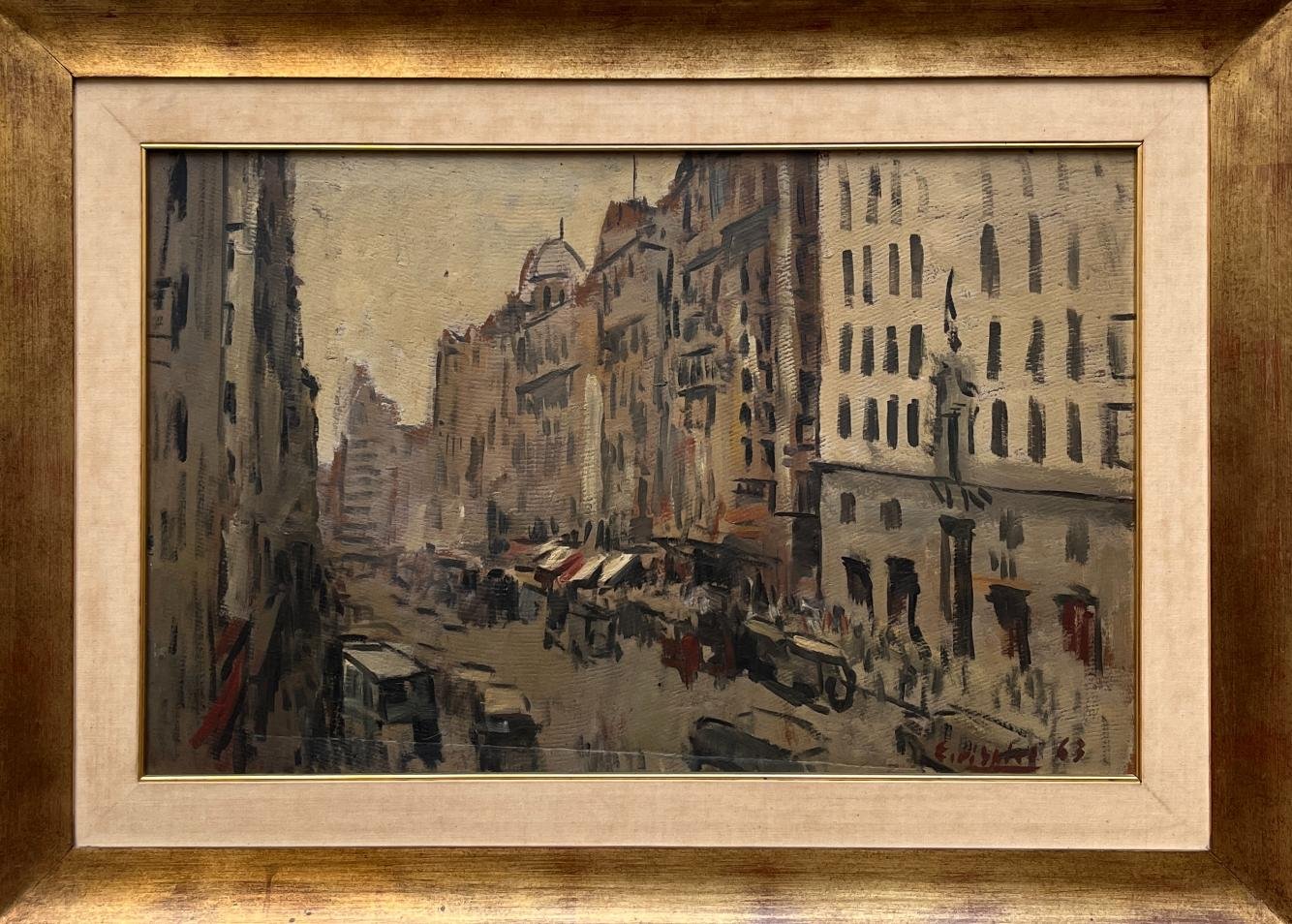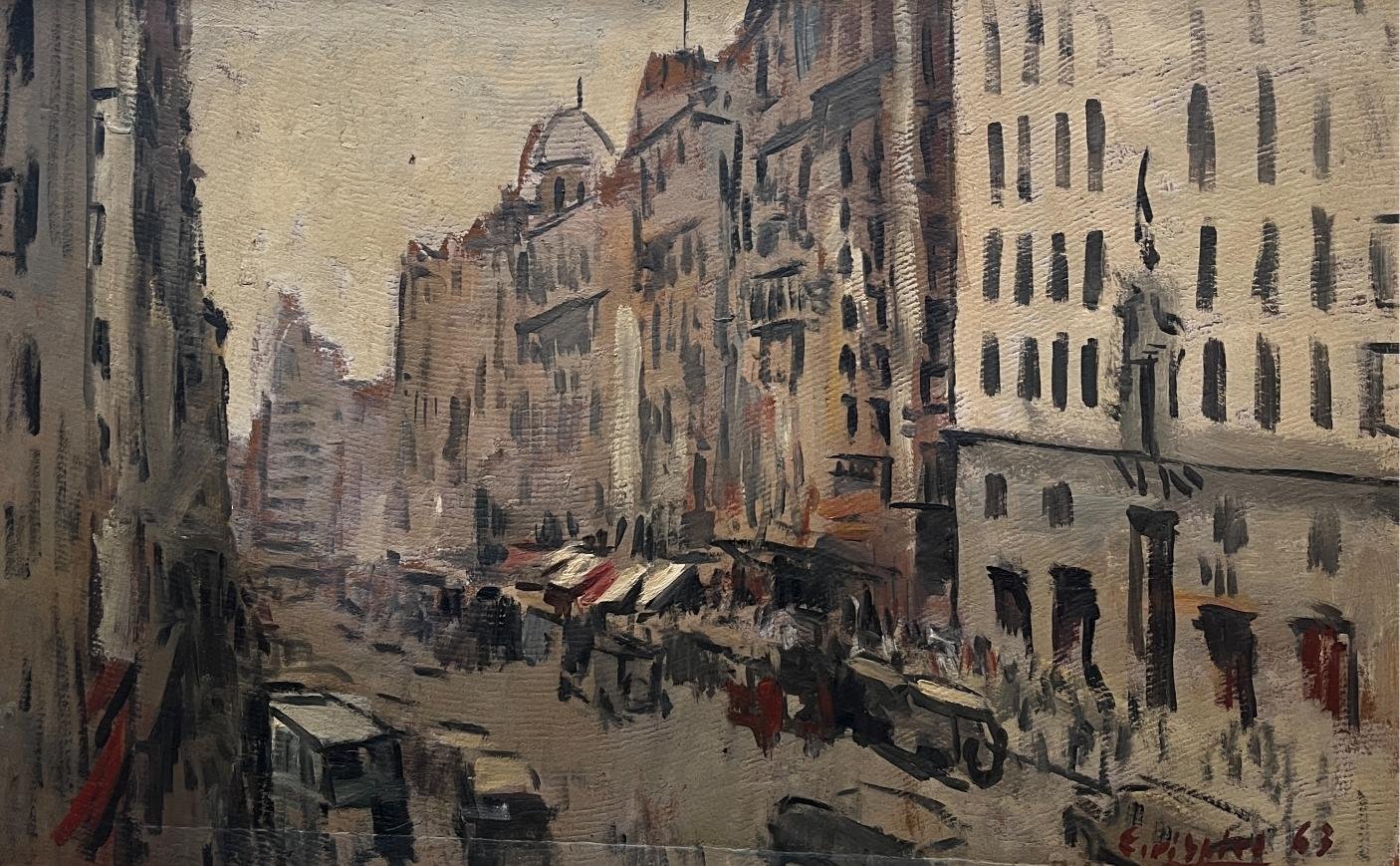EDGARDO RIBEIRO (Escuela uruguaya, 1921-2006) Óleo sobre cartón «Gran Vía de Madrid» Firmado y fechado «63» abajo a la derecha 50 x 80 cm