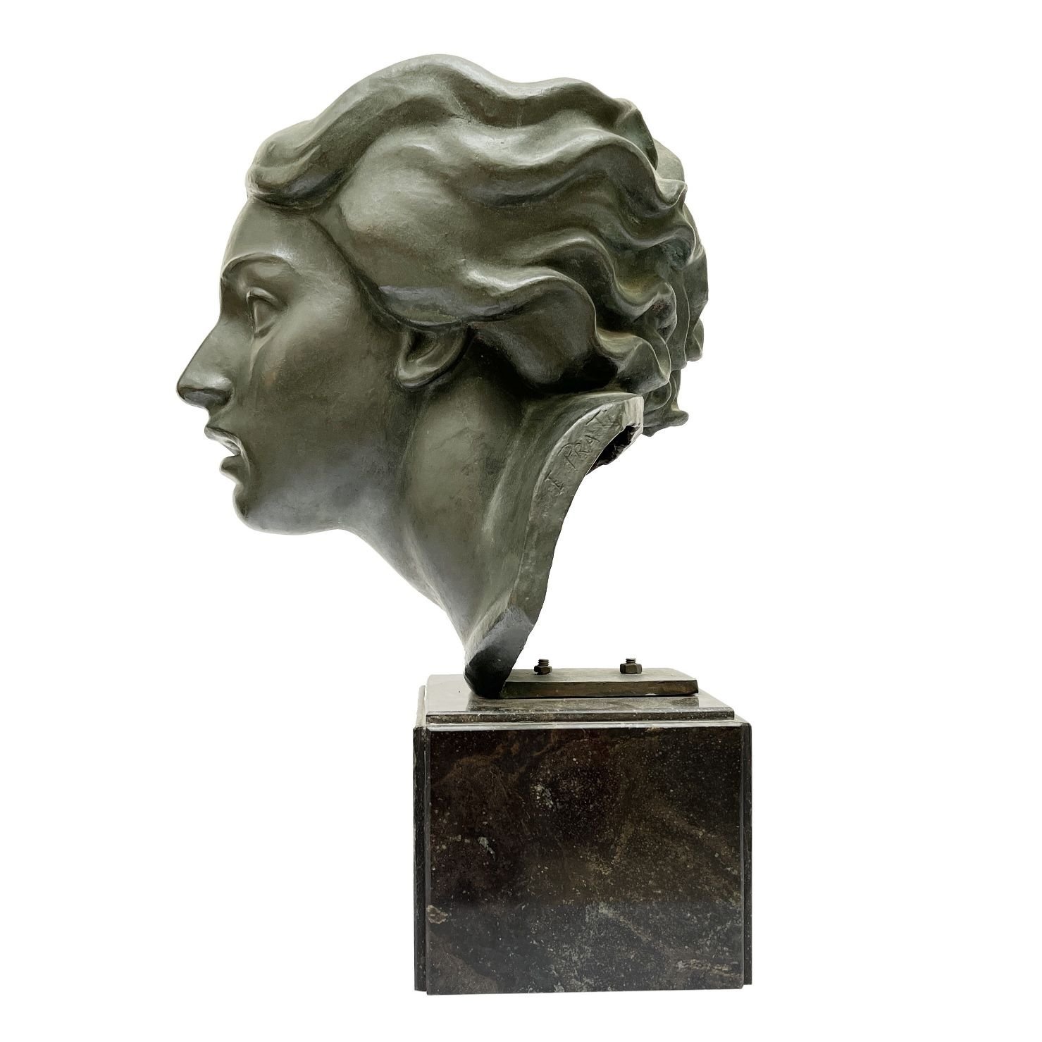 EDMUNDO PRATI (1889-1970) Escultura en bronce pátina oscura «Viento del sur» Firmada al borde a la derecha 40 x 29 x 40 cm Presentada sobre peana en granito negro Alto total 56 cm