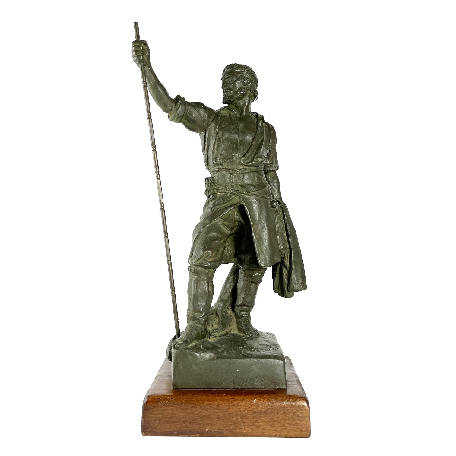 EDMUNDO PRATI (Uruguay, 1889-1970). Escultura en bronce pátina verde oscuro. «Gaucho lancero.» Firmada en la base. Alto 38 cm. Presentada sobre peana de madera. Alto total 42 cm. Faltante en punta de lanza.