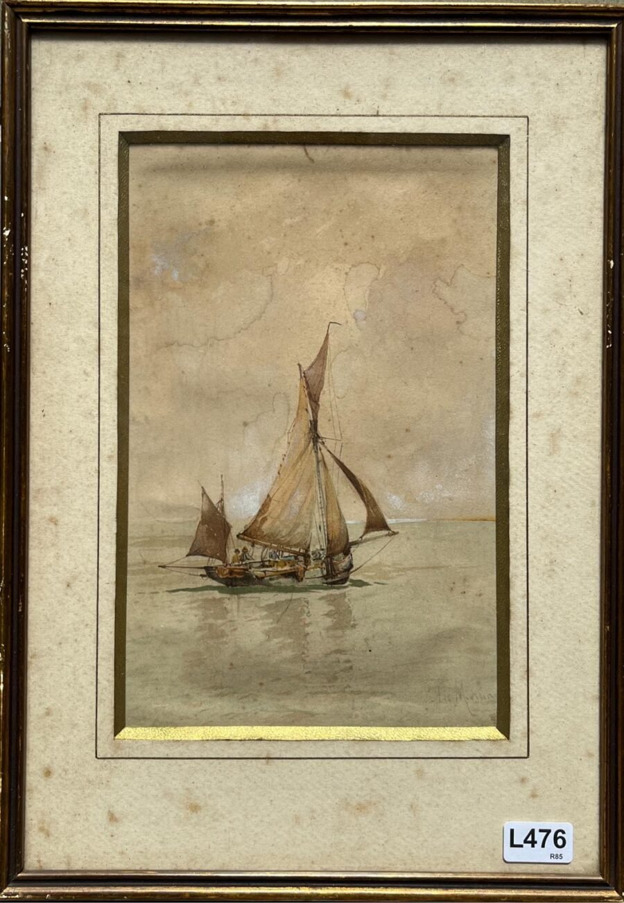 EDOARDO DE MARTINO (Escuela italiana, 1838-1912) Par de acuarelas sobre madera «Marinas» Firmadas abajo a la derecha Presentan manchas de humedad 32 x 15 cm
