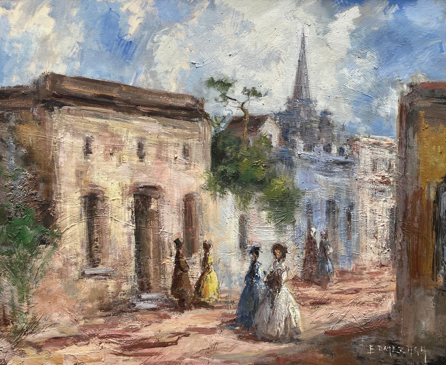 EDUARDO AMÉZAGA (1911-1997) «Paseo por la ciudad» Óleo sobre tela Firmado abajo a la derecha 60 x 73 cm