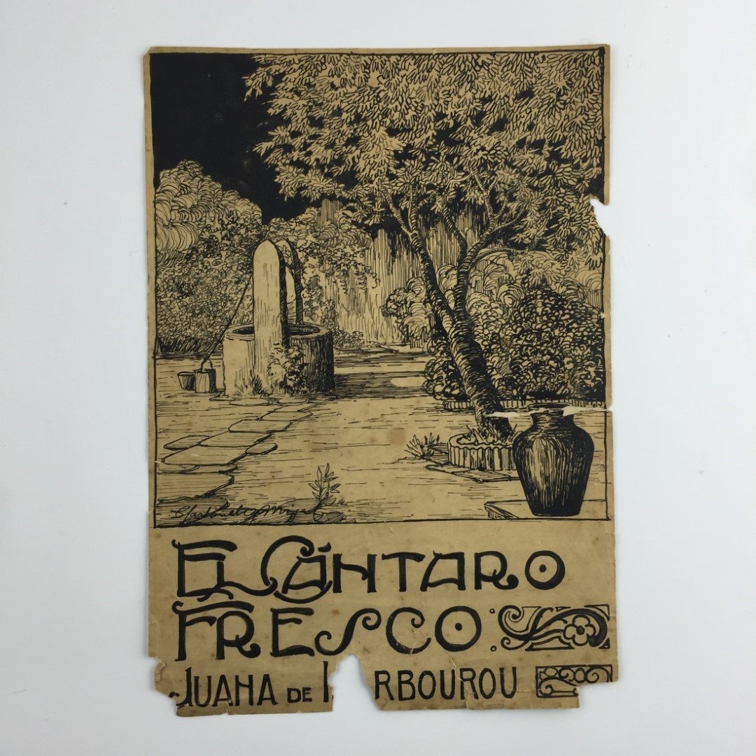 DE IBARBOUROU, Juana: «El Cántaro Fresco.» Montevideo, Imprenta Renacimiento. 1927. Acompañado por afiche realizado en tinta sobre papel con diseño original para la portada del libro, con averías y firma ilegible abajo a la izquierda. 32 x 22.5 cm. Ex colección Socorrito Villegas, ahijada de Juana de Ibarbourou.
