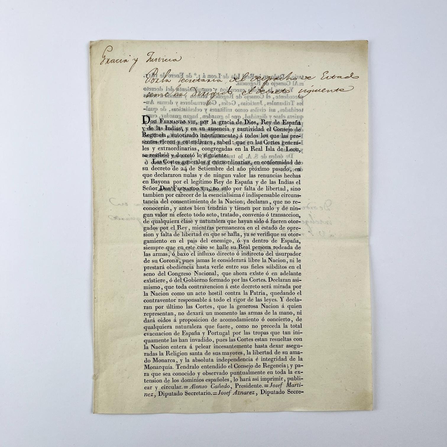 Con la península ocupada por las fuerzas napoleónicas y el trono español usurpado por José I Bonaparte, el Consejo de Regencia salva el honor del Rey prisionero, y declara nula sus decisiones adoptadas en cautiverio. En ese sentido desconocerán -advierte- todo acto, convenio, tratado o transacción mientras permanezca en estado de opresión y falta de libertad. Y en defensa de su integridad, las Cortes afirman que no dejarán un momento “las armas de la mano como no proceda la total evacuación de España y Portugal por las tropas que tan inicuamente las han invadido”. El Consejo ordena y manda a las instituciones que asuman estas decisiones que buscaban sostener la autoridad de Fernando VII.