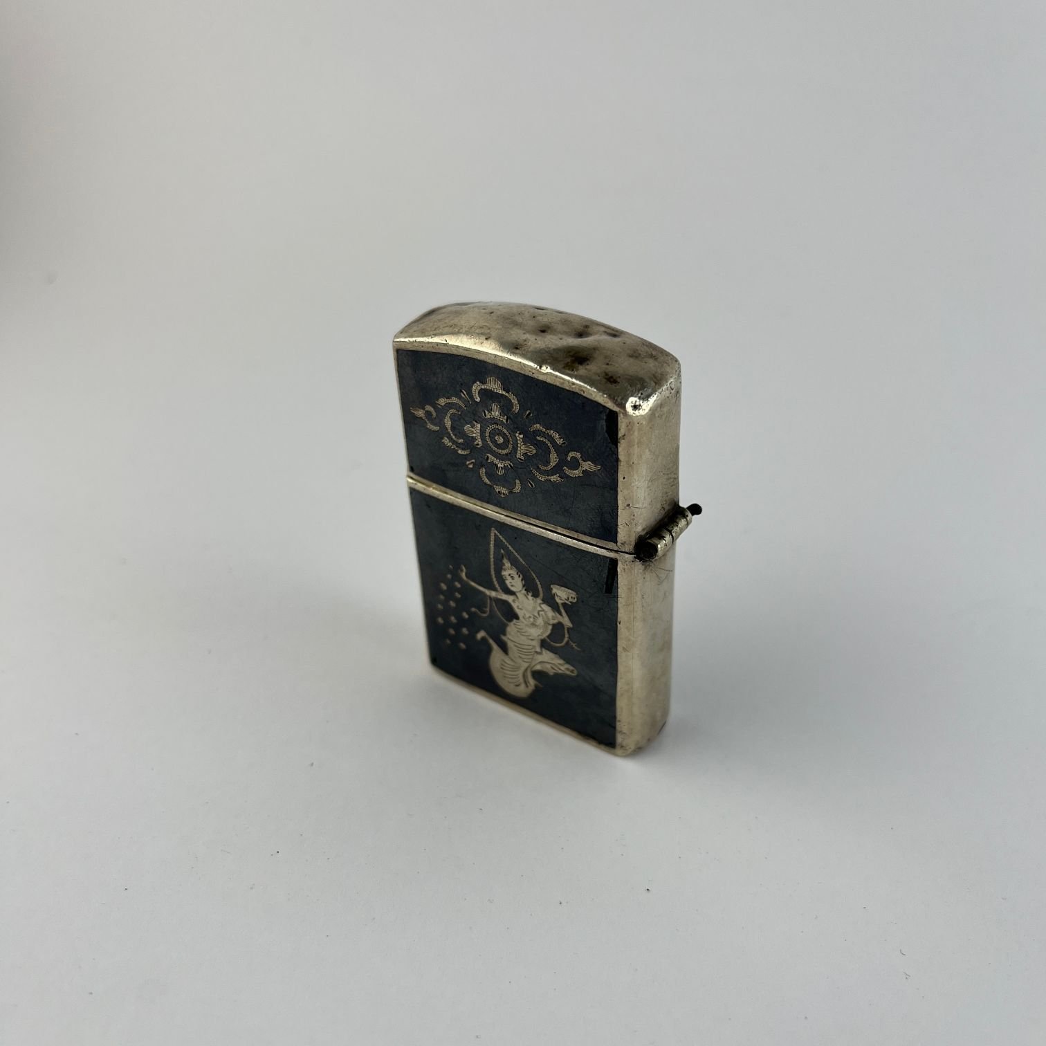 Encendedor tipo Zippo fabricado en Siam, en plata Sterling y esmalte negro decorado «deidades». Funcionando.