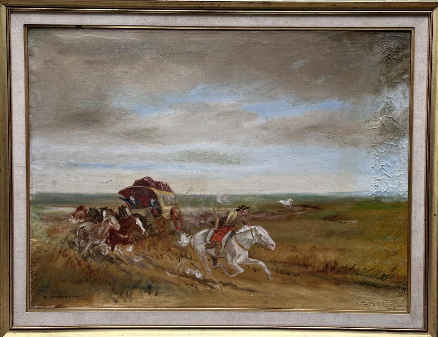 ENRIQUE CASTELLS CAPURRO (escuela uruguaya, 1913-1987). Óleo sobre tela. «La diligencia.» Firmado y fechado «67» abajo a la izquierda. 59 x 79 cm. Presenta área craquelada en óleo.