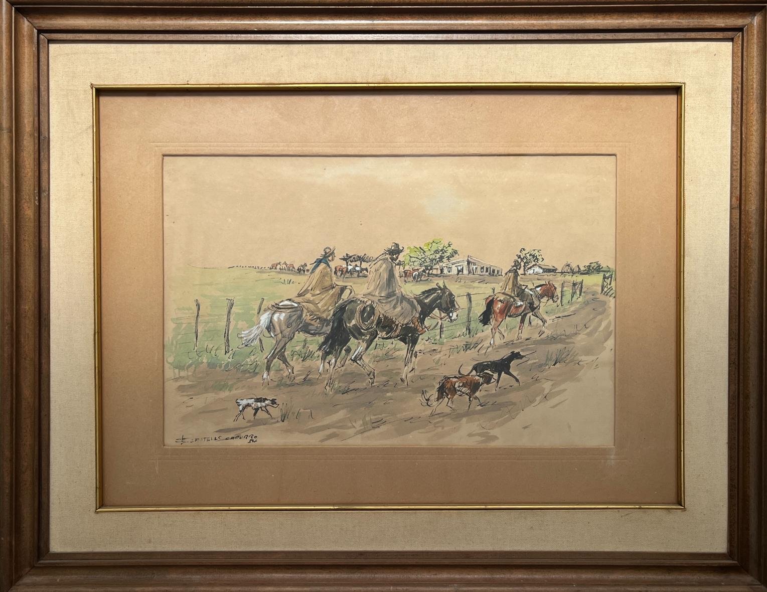 ENRIQUE CASTELLS CAPURRO (escuela uruguaya, 1913-1987). Acuarela sobre papel. «La vuelta.» Firmado y fechado «54» abajo a la izquierda. 30 x 46 cm.