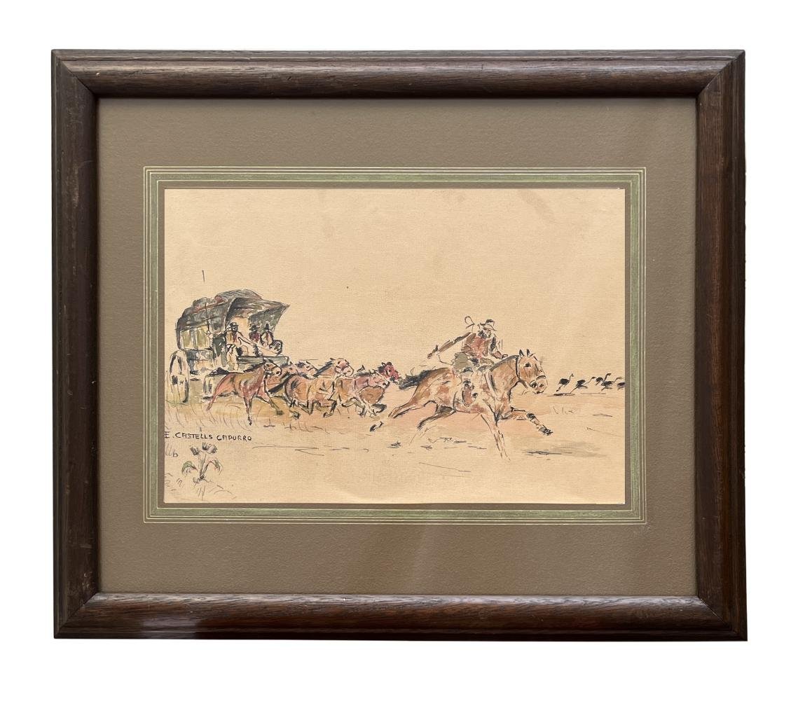 ENRIQUE CASTELLS CAPURRO (escuela uruguaya, 1913-1987). Acuarela sobre papel. «La carreta.» Firmado abajo a la izquierda. 21 x 31 cm.