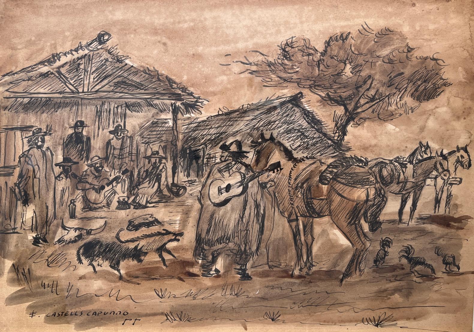 ENRIQUE CASTELLS CAPURRO (escuela uruguaya, 1913-1987). Tinta y acuarela sobre papel. «Guitarreada.» Firmado y fechado «55» abajo a la izquierda. 28 x 39.5 cm.