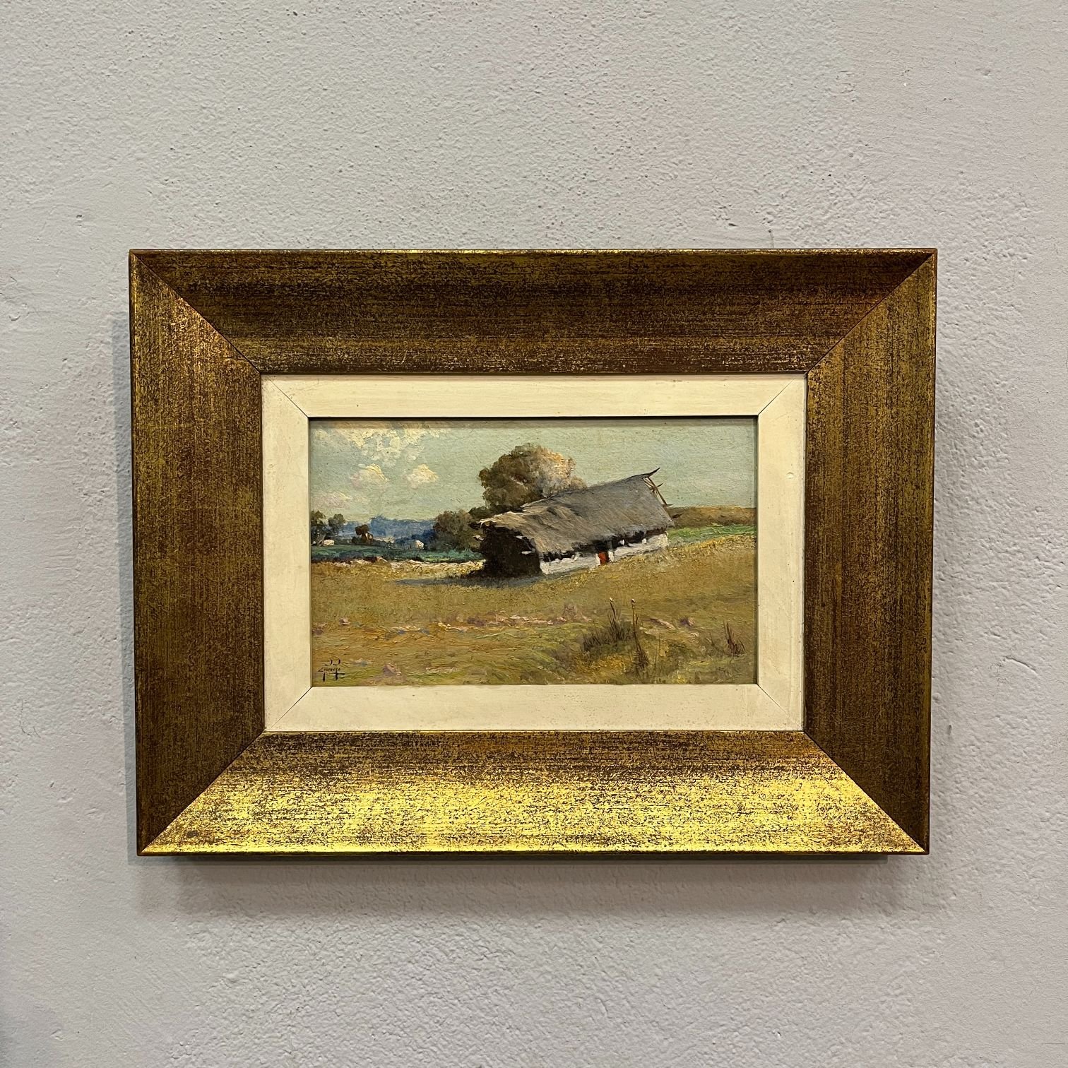 ERNESTO LAROCHE (Uruguay, 1879-1940). Óleo sobre cartón. “Paisaje de campo y rancho.” Firmado abajo a la izquierda. 12 x 20 cm.