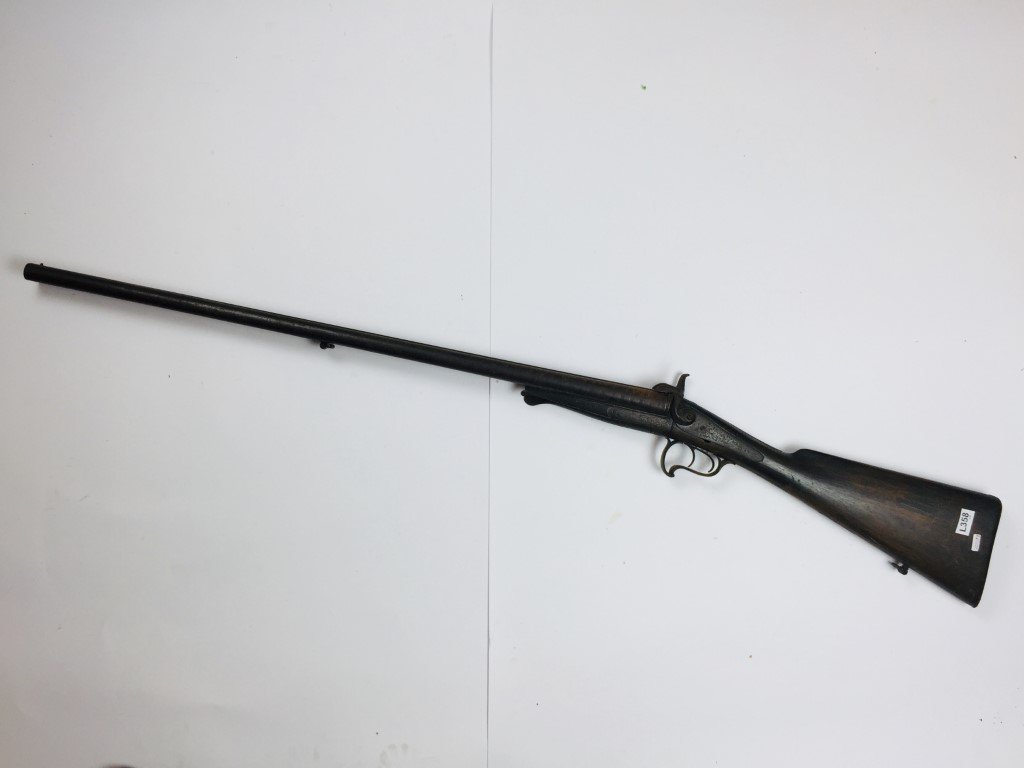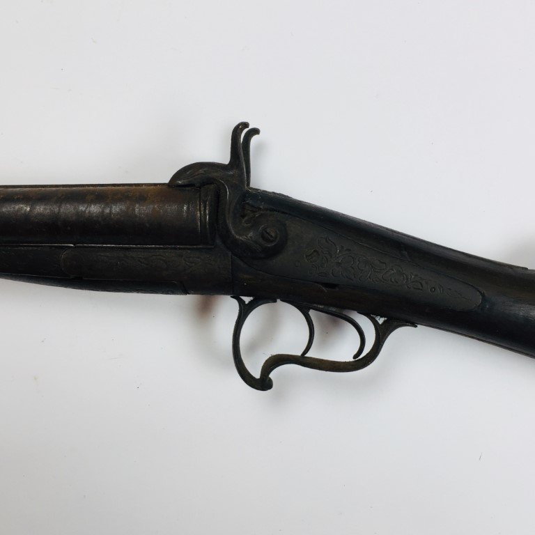 Escopeta calibre 16 sistema Lefaucheux con dos caños yuxtapuestos y caja cincelada «hojas».