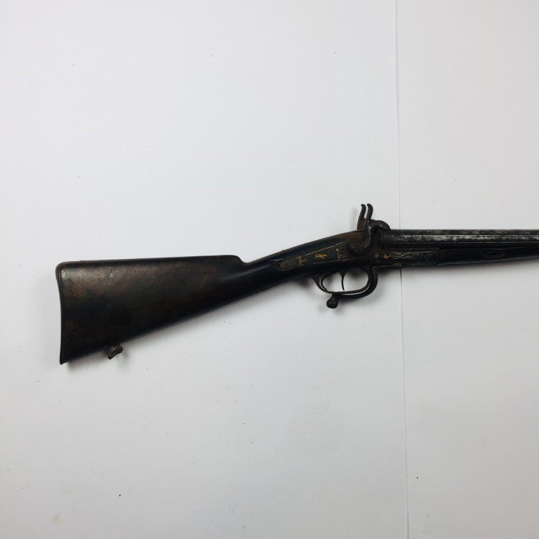 Escopeta sistema Lefaucheux. Dos caños yuxtapuestos, calibre 16. Caja y platina decorada «animales» en plata y oro. Chimaza y culata en madera lisa.