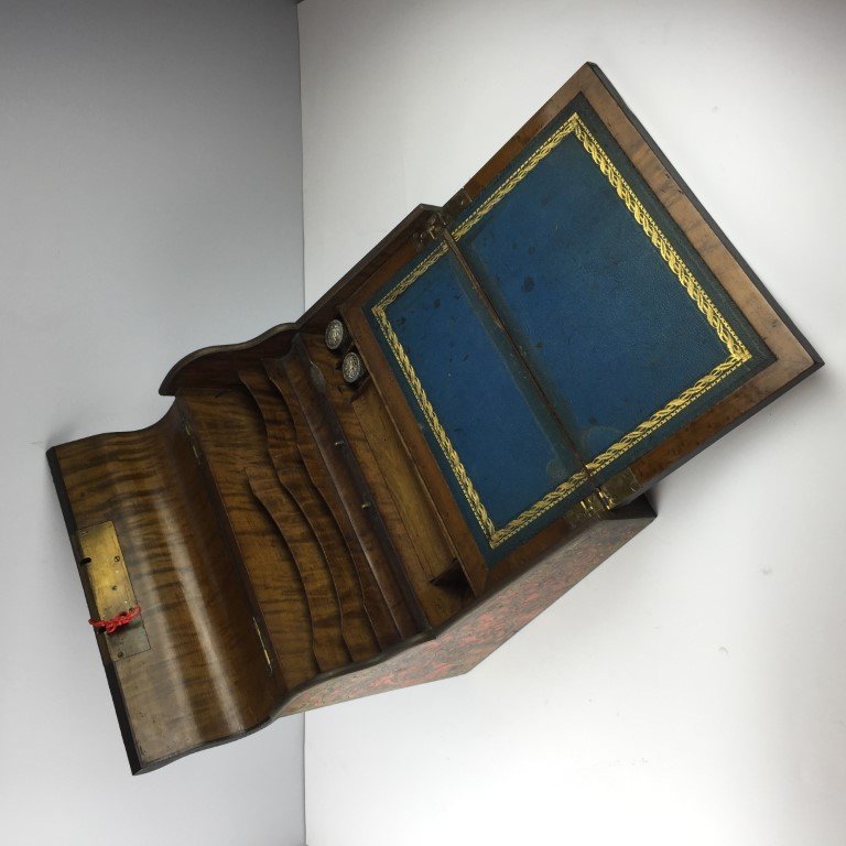 Escribanía de sobremesa estilo Boulle. Interior con divisiones, cortapluma y dos tinteros. 22 x 36 x 39 cm. Con pequeñas averías y faltantes.