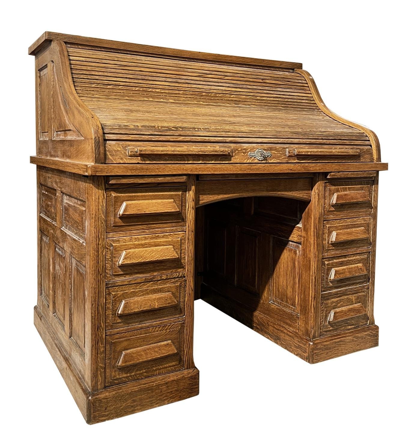 Escritorio estadounidense de persiana, tipo camello, en roble. Fabricado por The Cunn Desk. Nueve cajones frontales, dos tablas auxiliares deslizantes e interior con diecinueve pequeños cajones, un cofre y dos portaplumas. Persiana funcionando, con llave. Trasera perforada. 126 x 127 x 89 cm.