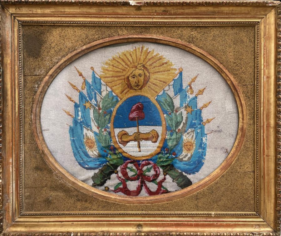 Escudo de armas argentino antiguo s. XIX totalmente bordado en mostacillas. Presentado en marco de madera dorada. Pequeñas averías. 50 x 53 cm.