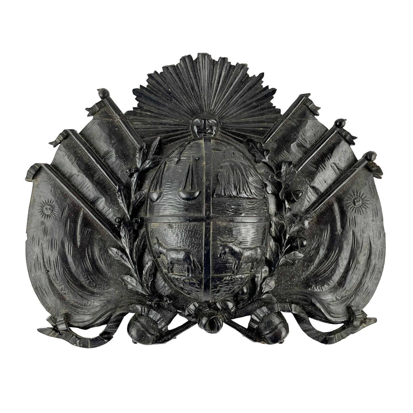 Escudo de armas uruguayo antiguo en madera tallada c. 1880. 25 x 31 cm. Pequeños faltantes.