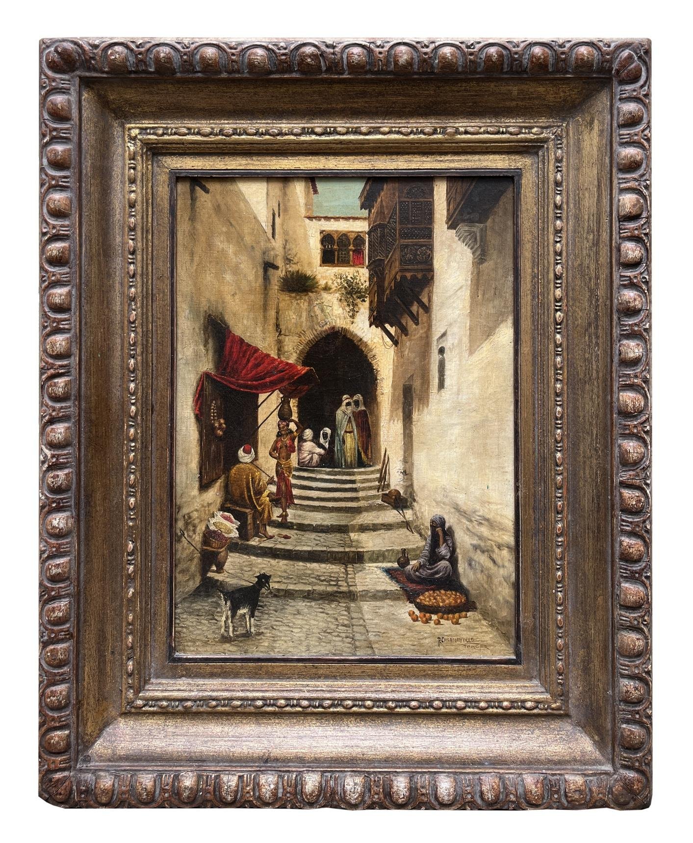 Escuela europea s. XIX Óleo sobre tela «Escena orientalista» Firma ilegible y situado «Tánger» abajo a la derecha 40 x 30 cm Presenta pequeña restauración en óleo