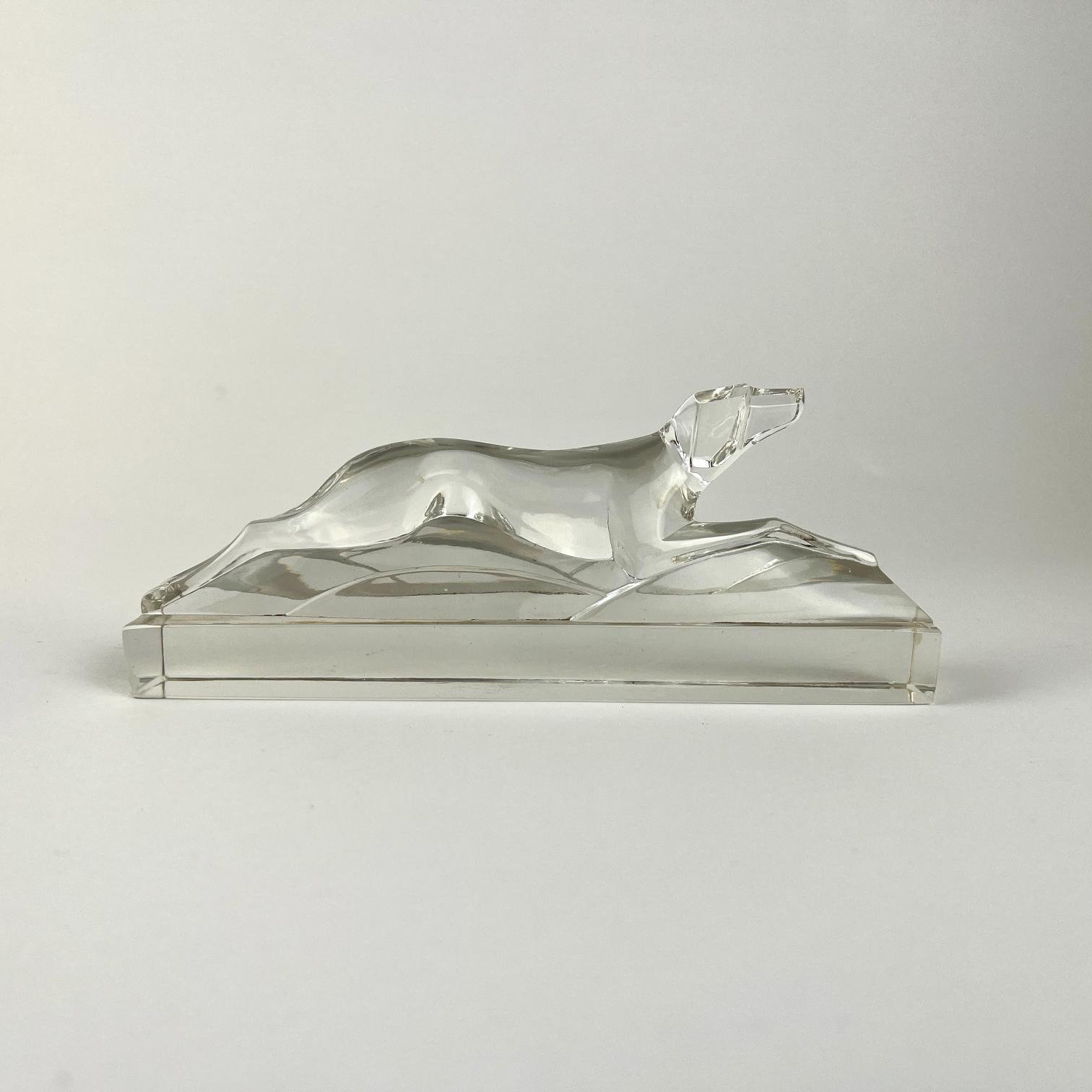Escultura art decó francesa en cristal Daum. «Perro galgo.» Firmado «Daum France» en la base con letra cursiva. 7 x 18 x 4 cm. Con pequeños rebajes en vértices de base.