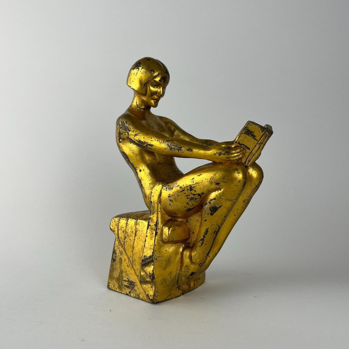 Escultura art decó en bronce dorado al mercurio. «La lectura.» 18 x 12 x 5 cm. Pequeñas averías.