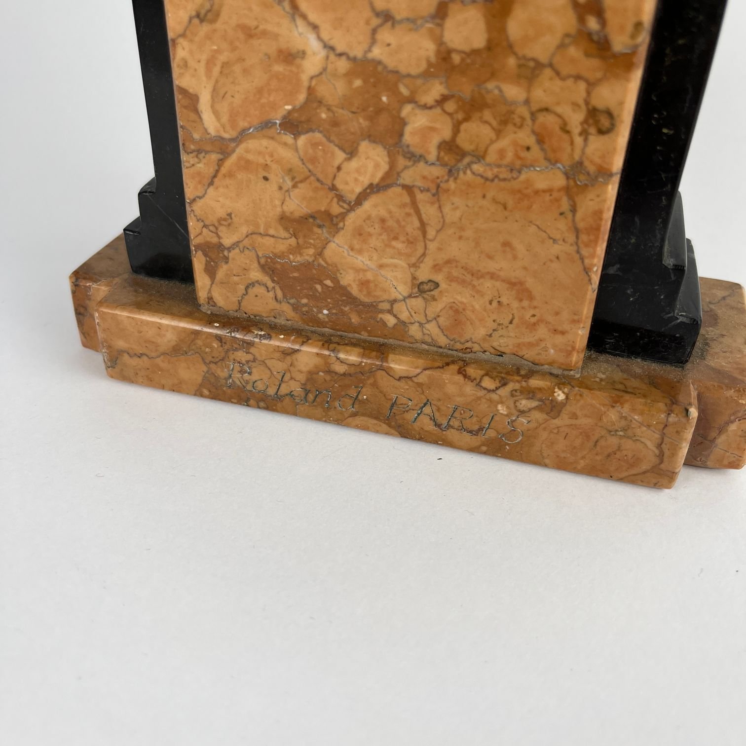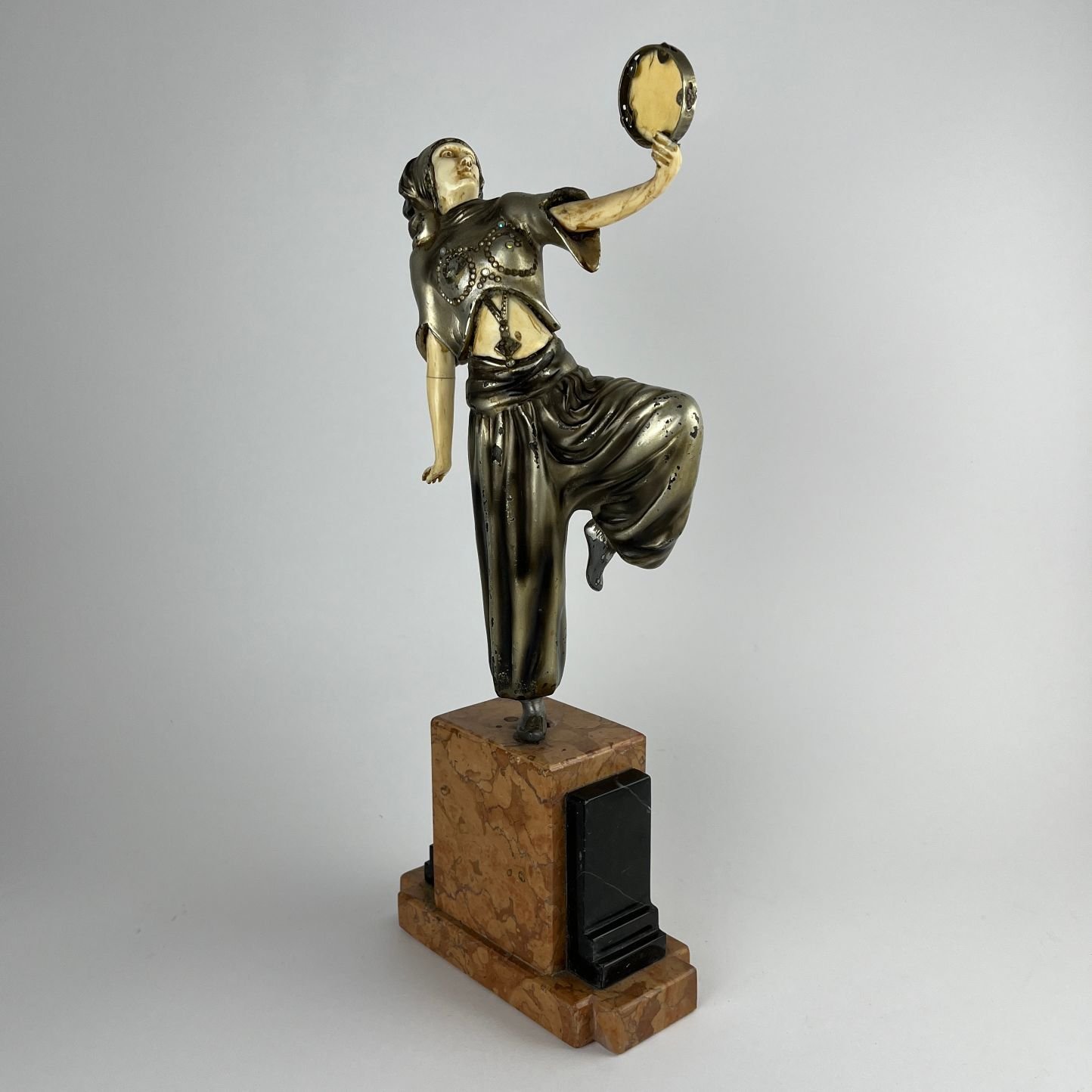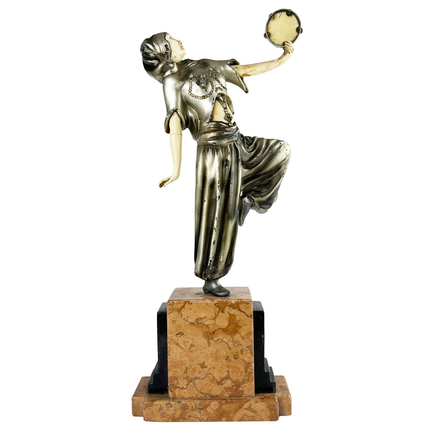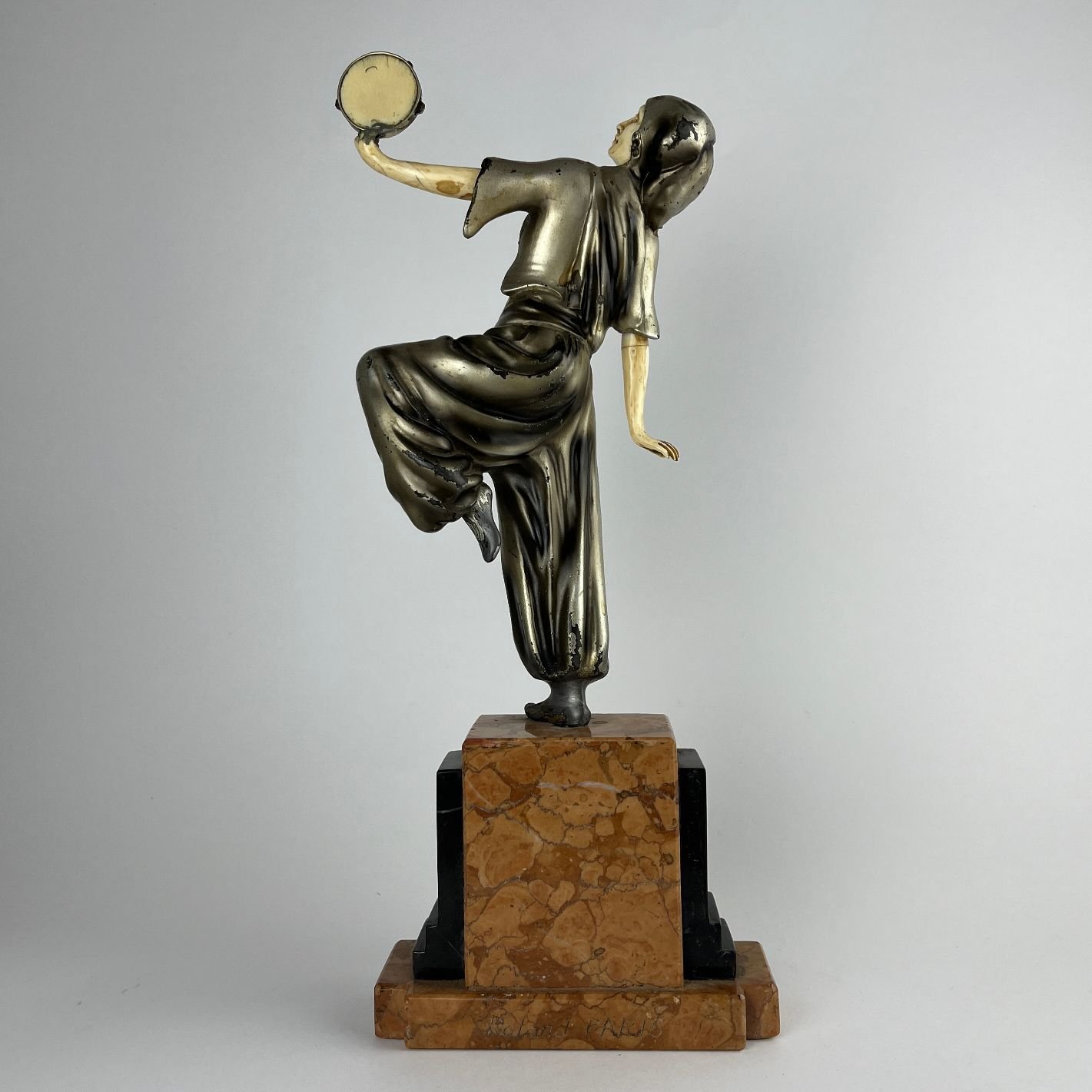 Escultura art decó criselefantina en metal policromado. «Bailarina.» Presentada sobre peana en mármol y granito. Presenta antiguas restauraciones. 34 x 15 x 6.5 cm. Firmada en la base «Roland Paris».