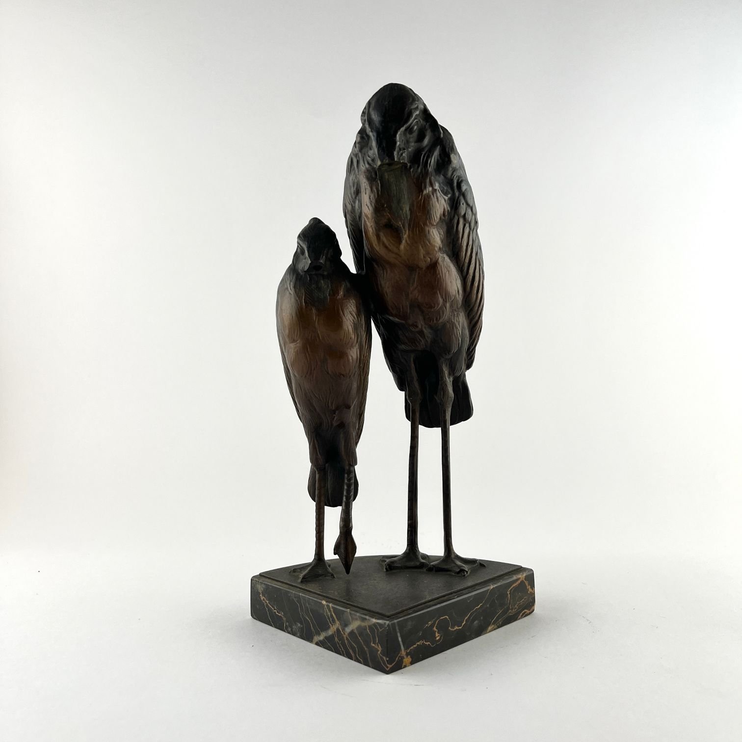 Escultura art decó en bronce pátina marrón. «Garzas.» Alto 21 cm. Presentado sobre peana en granito negro. Alto total 23 cm. Faltan picos en garzas.