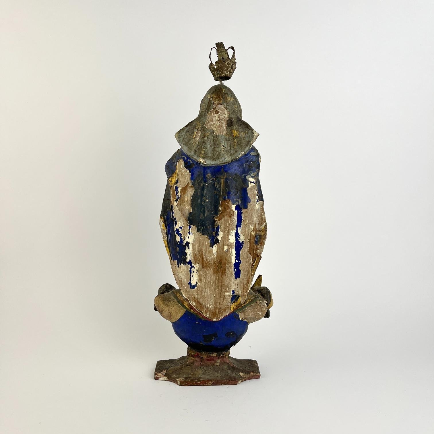 Escultura bahiana s. XVIII en madera tallada y policromada sobre estuco, con detalles en dorado y corona en hojalata. «Inmaculada concepción.» Alto total 31 cm.