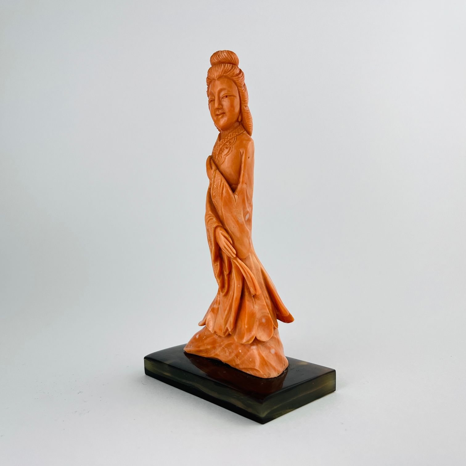 Escultura china en coral tallado «geisha». Alto 11 cm. Base en ágata. Alto total 12 cm.